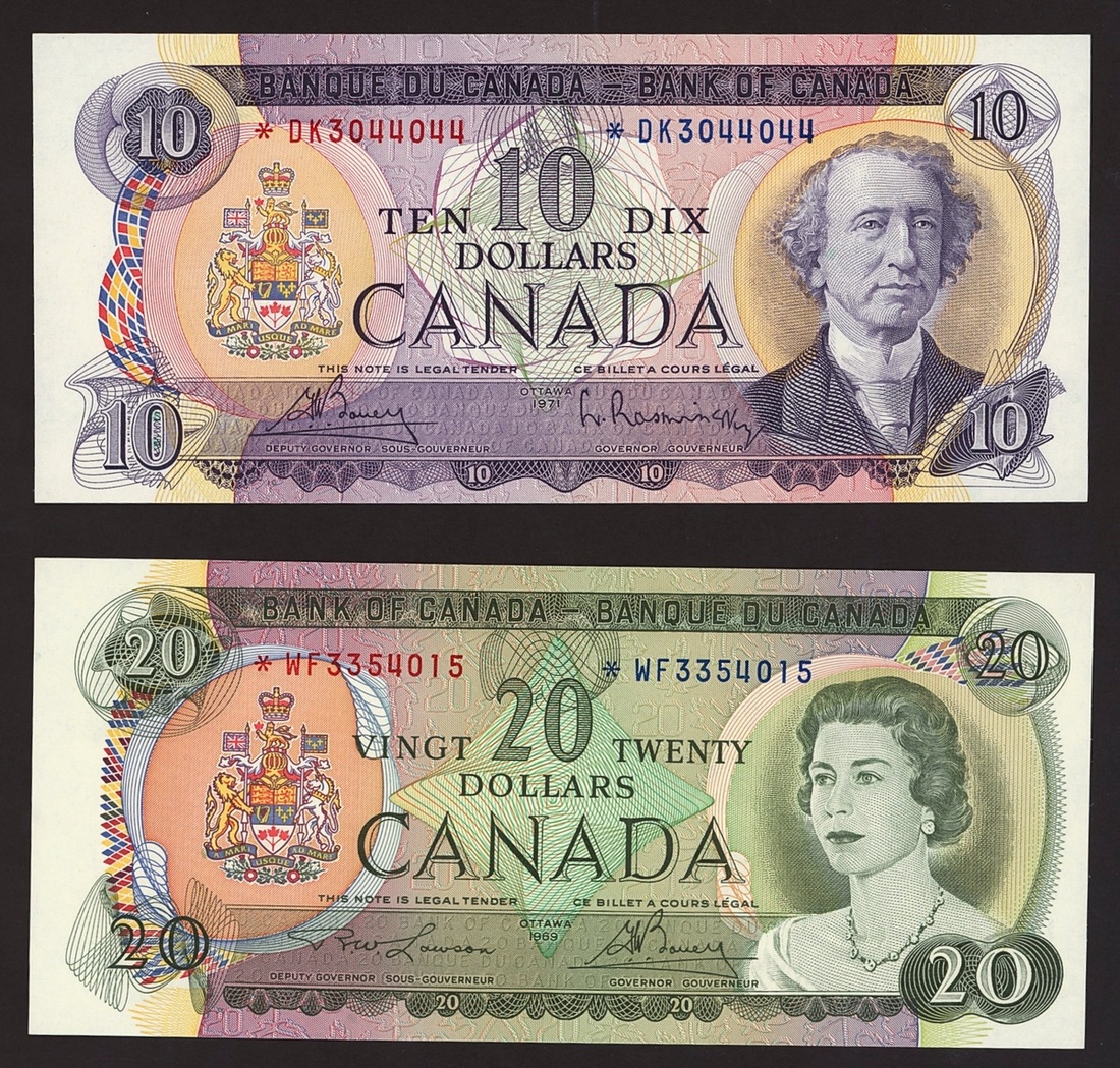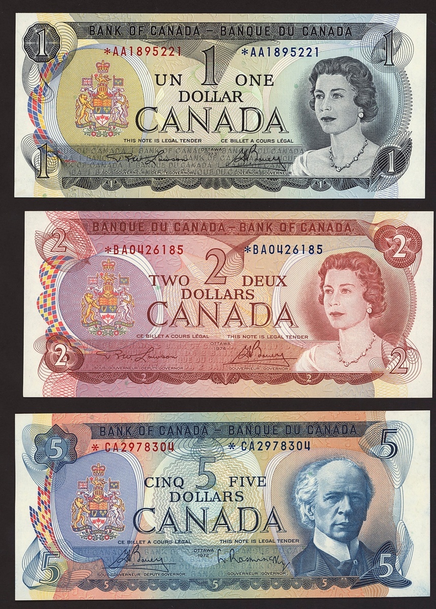 Bank of Canada, a partial set of replacement of the 1969-79 series, including $1 1973, $5 1974, $5 1972, $10 1971, $20 1969,