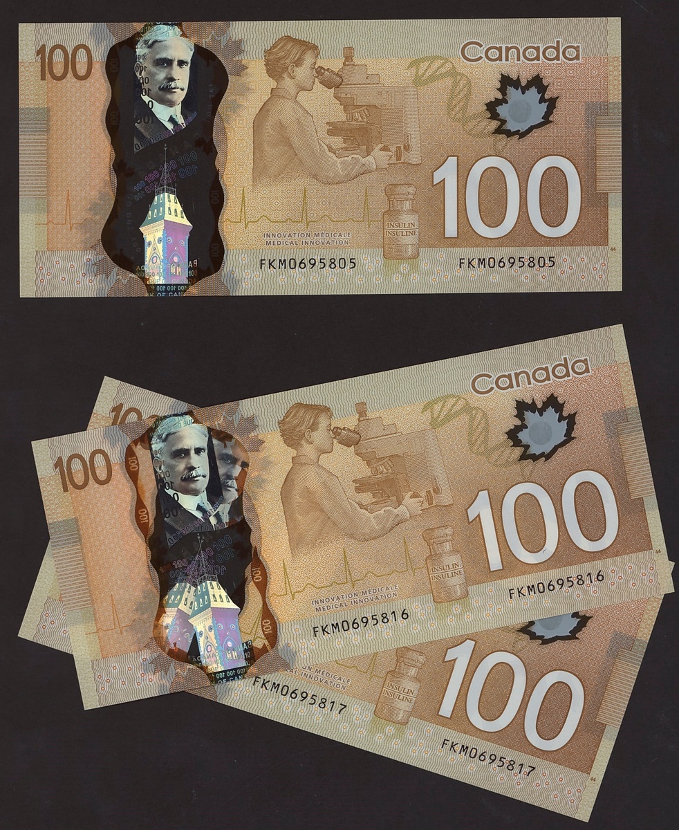 (x) Bank of Canada, polymer $100 (3), 2011, (Pick 110), uncirculated (3 notes)