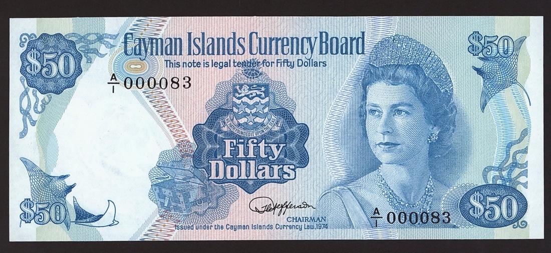 Cayman Islands Currency Board, 50 dollars, 1974 (1986), serial number A/1 000083, (Pick 10a, B110a), uncirculated, low serial number.