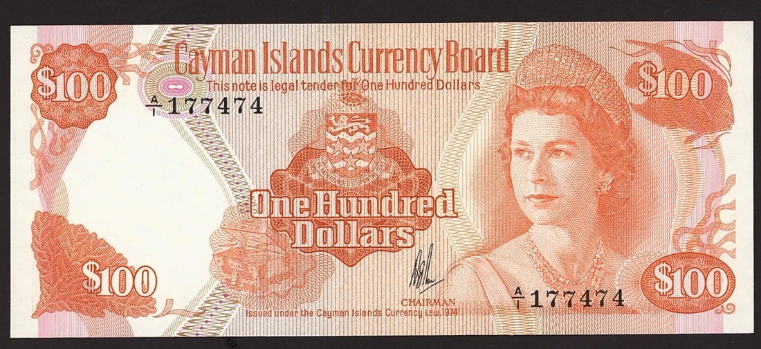 Cayman Islands Currency Board, 100 dollars, 1974, serial number A/1 177474, (Pick 11a, B111a), about uncirculated.