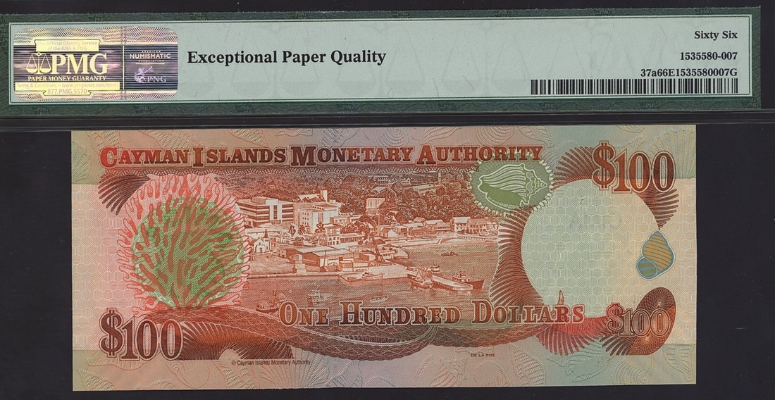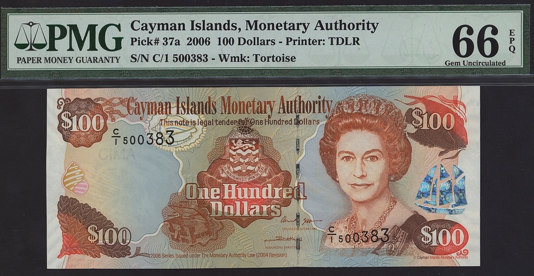 Cayman Islands, Monetary Authority, 100 dollars, 2006, serial number C/1 500383, (Pick 37a), in PMG holder 66 EPQ Gem Uncirculated.
