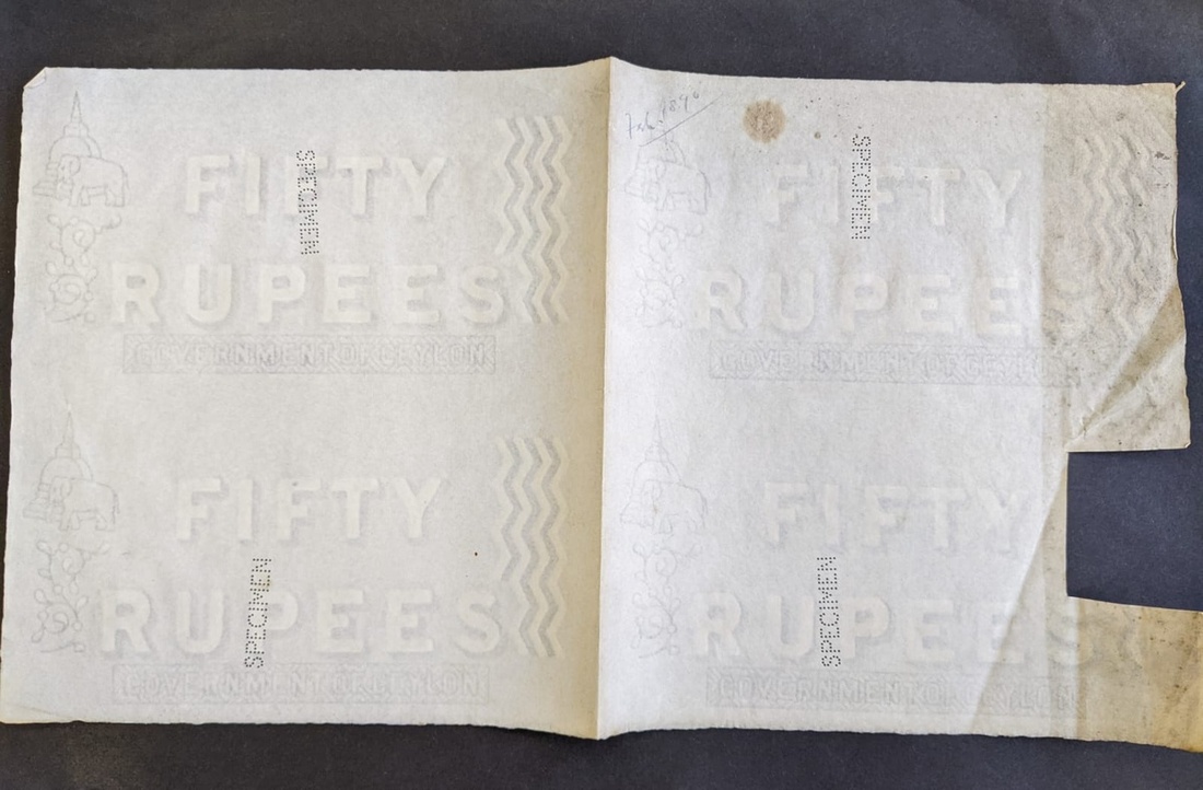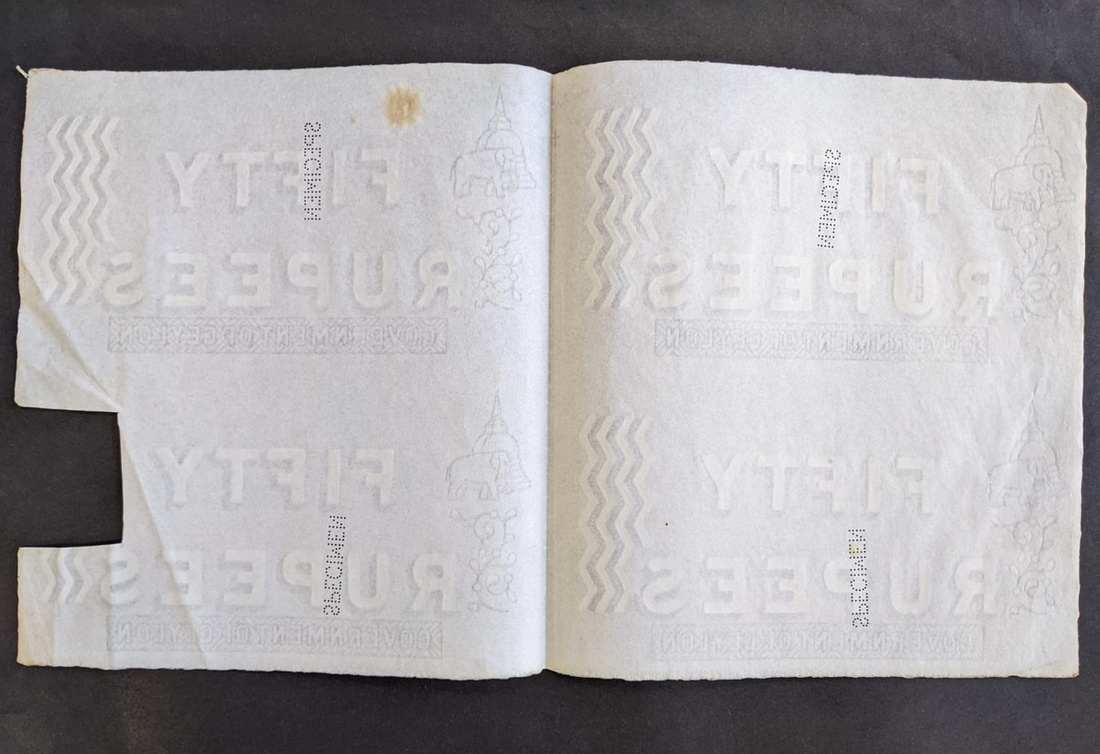 Government of Ceylon, a sheet of watermark paper for four 50 rupees, ND (1885-1926), with "FIFTY RUPEES" at centre, "GOVERNMENT OF CELYON" at lower margin, elephant, stupa and flower at left,