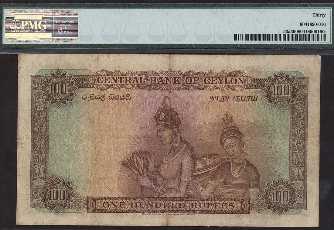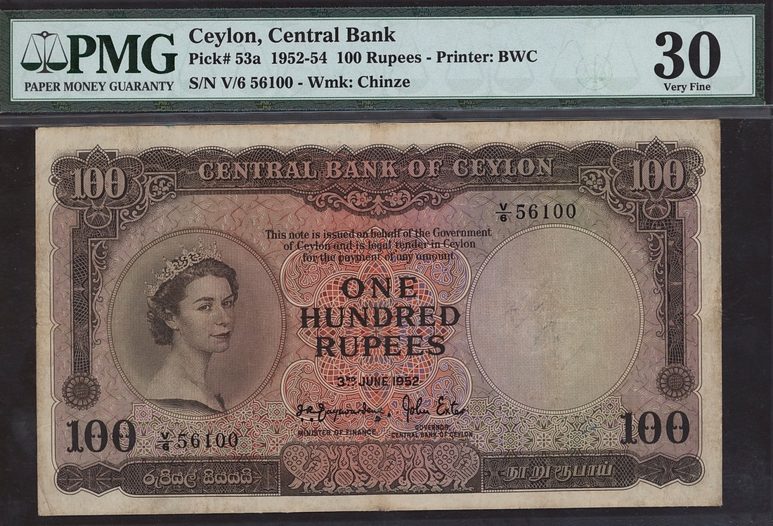 (x) Central Bank of Ceylon, 100 rupees, 1952, serial number V/6 56100, (Pick 53a), in PMG holder 30 Very Fine