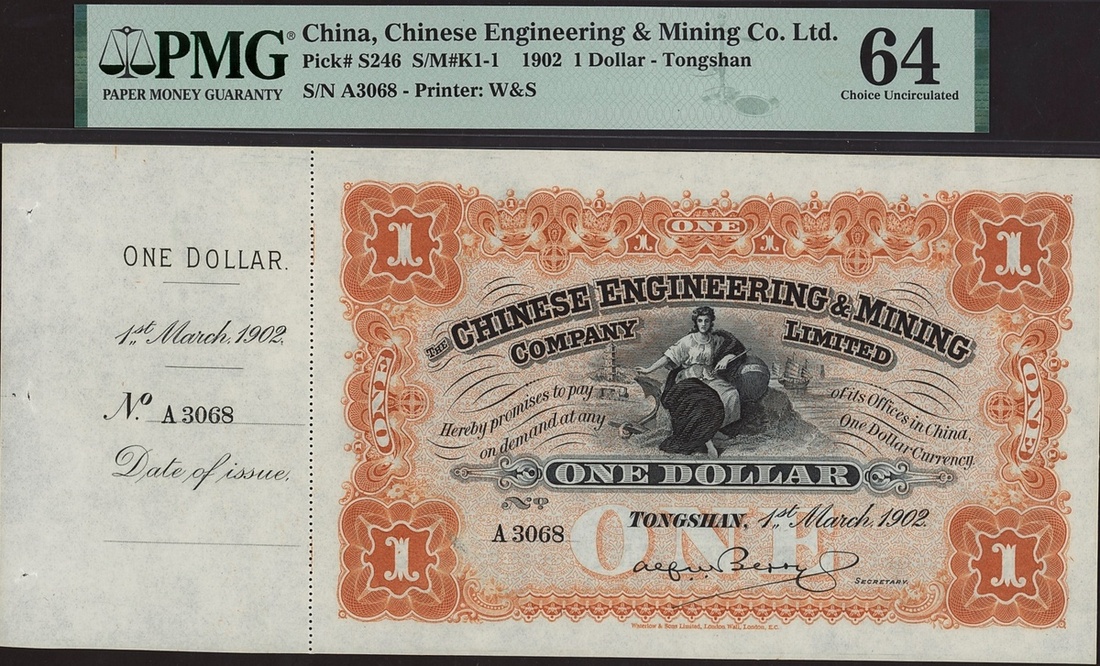 Chinese Engineering & Mining Company Limited, China, 1 dollar, Tongshan, 1 March 1902, serial number A3068, (Pick S246, Smith-Matravers K1-1), in PMG holder, with counterfoil, 64 Choice Uncirculated. Lovely Waterlow design