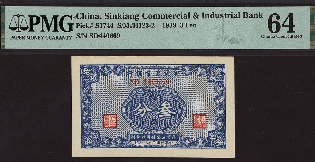 Sinkiang Commercial & Industrial Bank, China, 3 fen, 1939, serial number SD440669, (Pick S1744), in PMG holder 64 Choice Uncirculated
