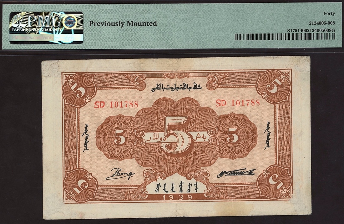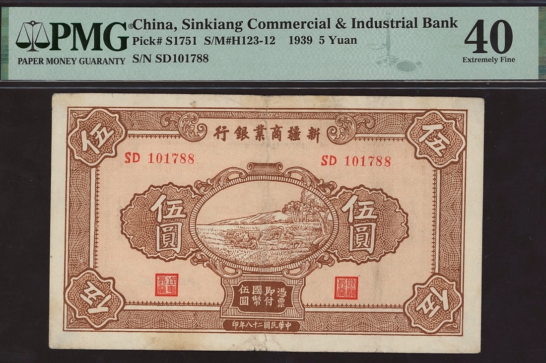 Sinkiang Commercial & Industrial Bank, China, 5 yuan, 1939, serial number SD 101788, (Pick S1751), in PMG holder, previously mounted, 40 Extremely Fine. One of five graded on PMG