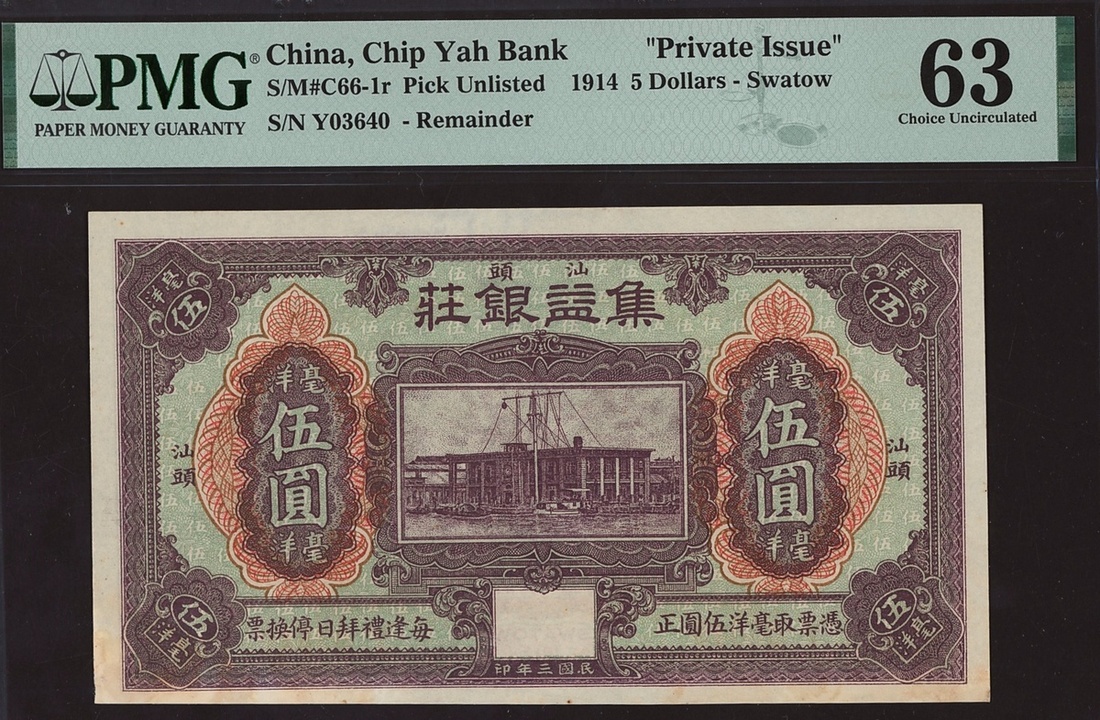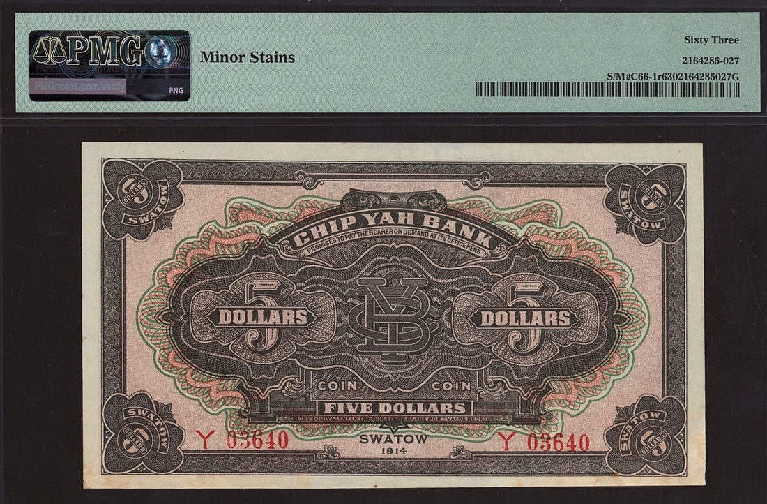Chip Yah Bank, China, remainder 5 dollars, Swatow, serial number Y03640, (Pick unlisted, Smith-Matravers C66-1r), in PMG holder, minor stains, 63 Choice Uncirculated