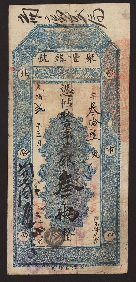 Ju Feng Yin Hao, Qing Dynasty Private Issue, China, 3 taels, Year 2 of Xuantong (1910), annotations at reverse, minor corner damage, fine