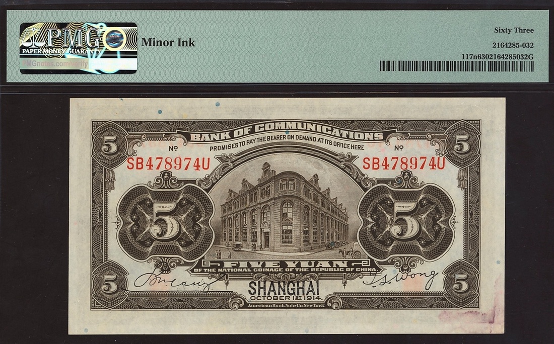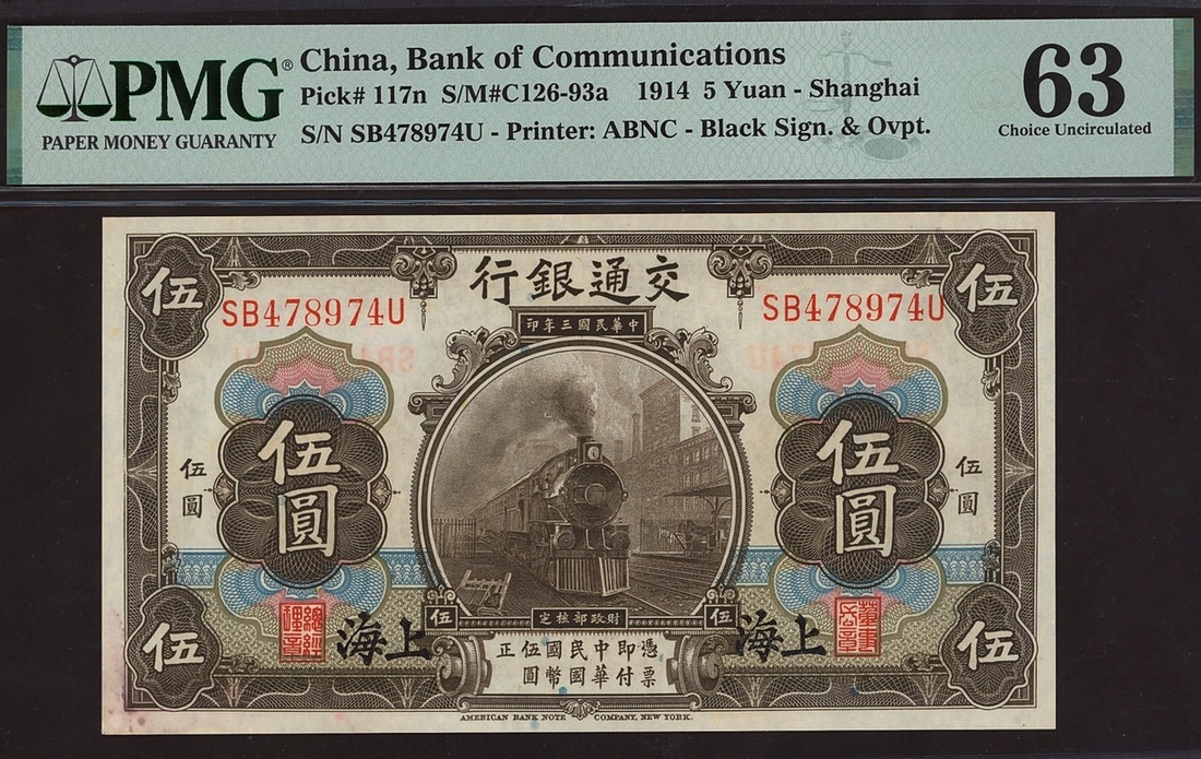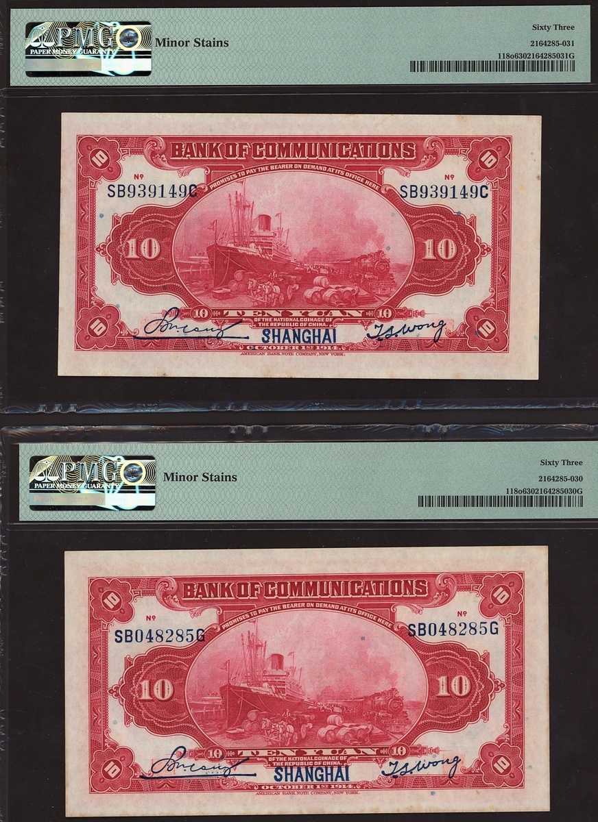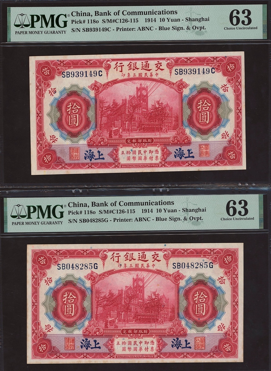 Bank of Communications, China, 5 yuan, 10 yuan (2), 1914, (Pick 117n, 118o), all in PMG holders 63 Choice Uncirculated (3 notes)