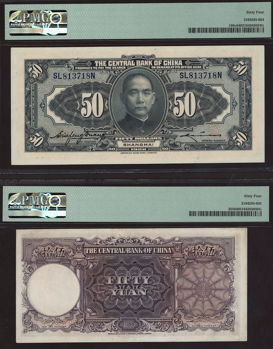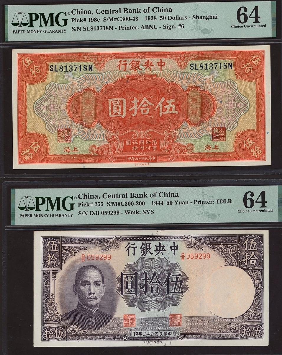 Central Bank of China, 50 dollars 1928, and 50 yuan 1944, (Pick 198c, 255), in PMG holders 64 Choice Uncirculated (2 notes)