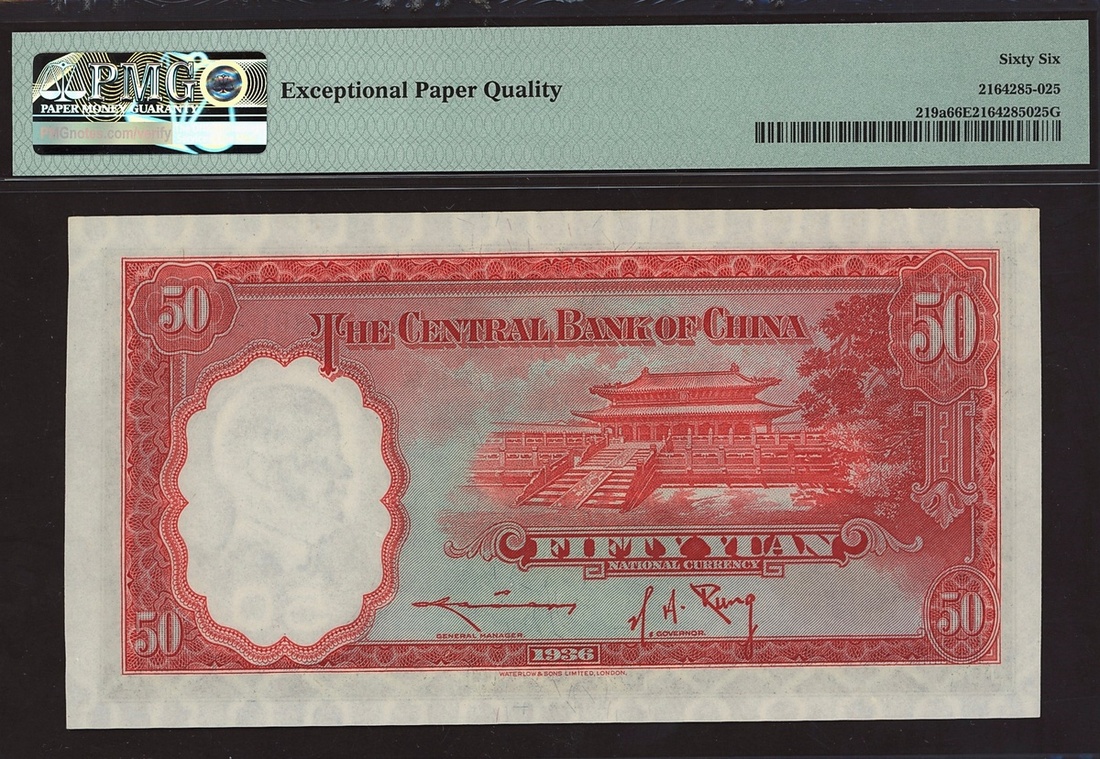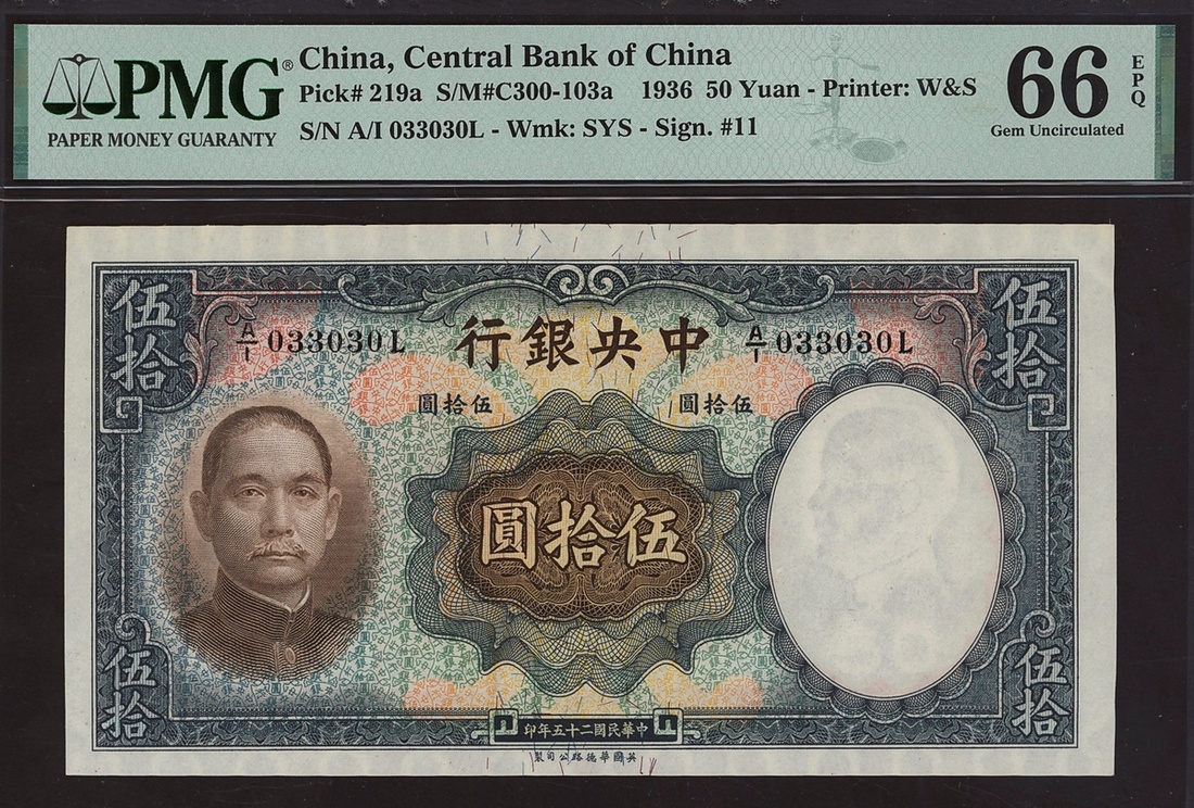Central Bank of China, 50 yuan, 1936, serial number A/I 033030L, (Pick 219a), in PMG holder 66 EPQ Gem Uncirculated