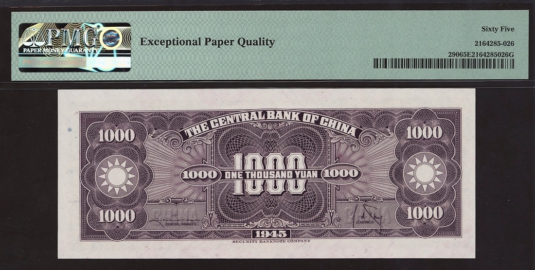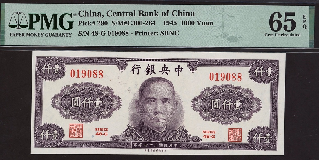 Central Bank of China, 1000 yuan, 1945, serial number 48-G 019088, (Pick 290), in PMG holder 65 EPQ Gem Uncirculated