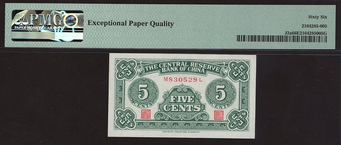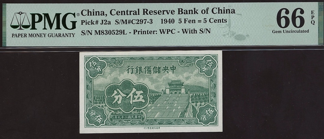 Central Reserve Bank of China, 5 fen, 1940, serial number M830529L, (Pick J2a), in PMG holder 66 EPQ Gem Uncirculated