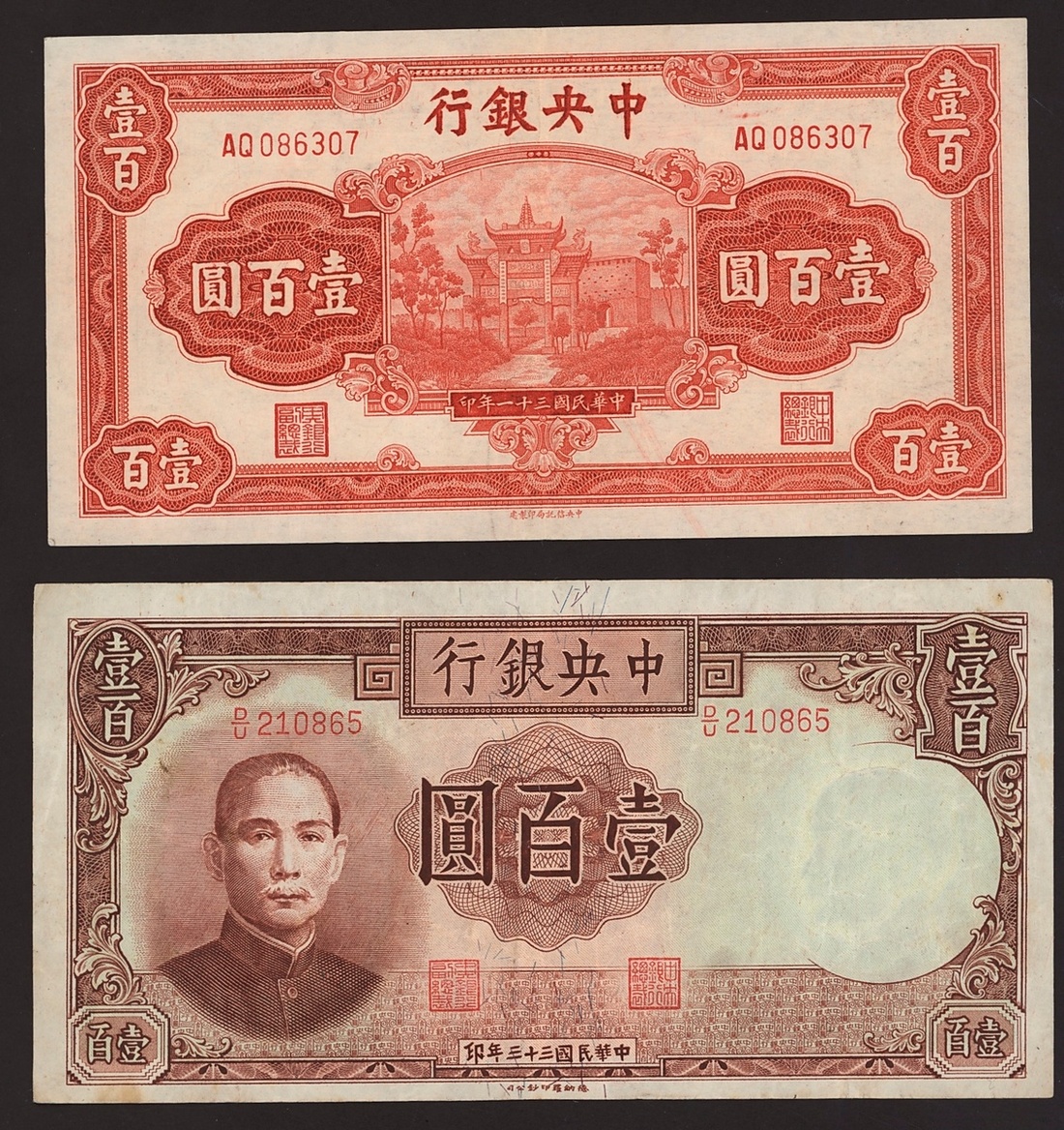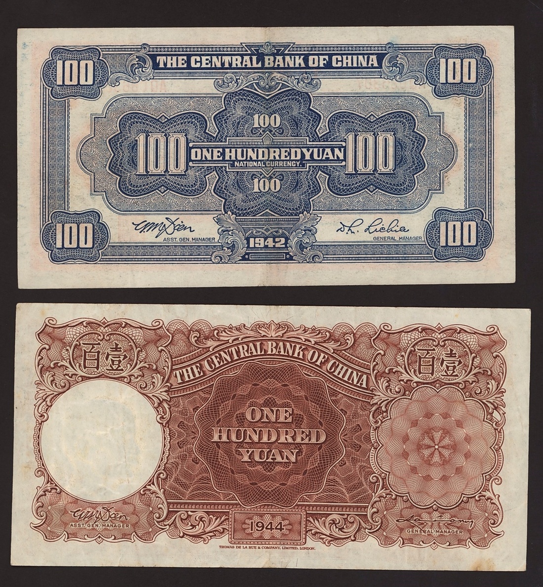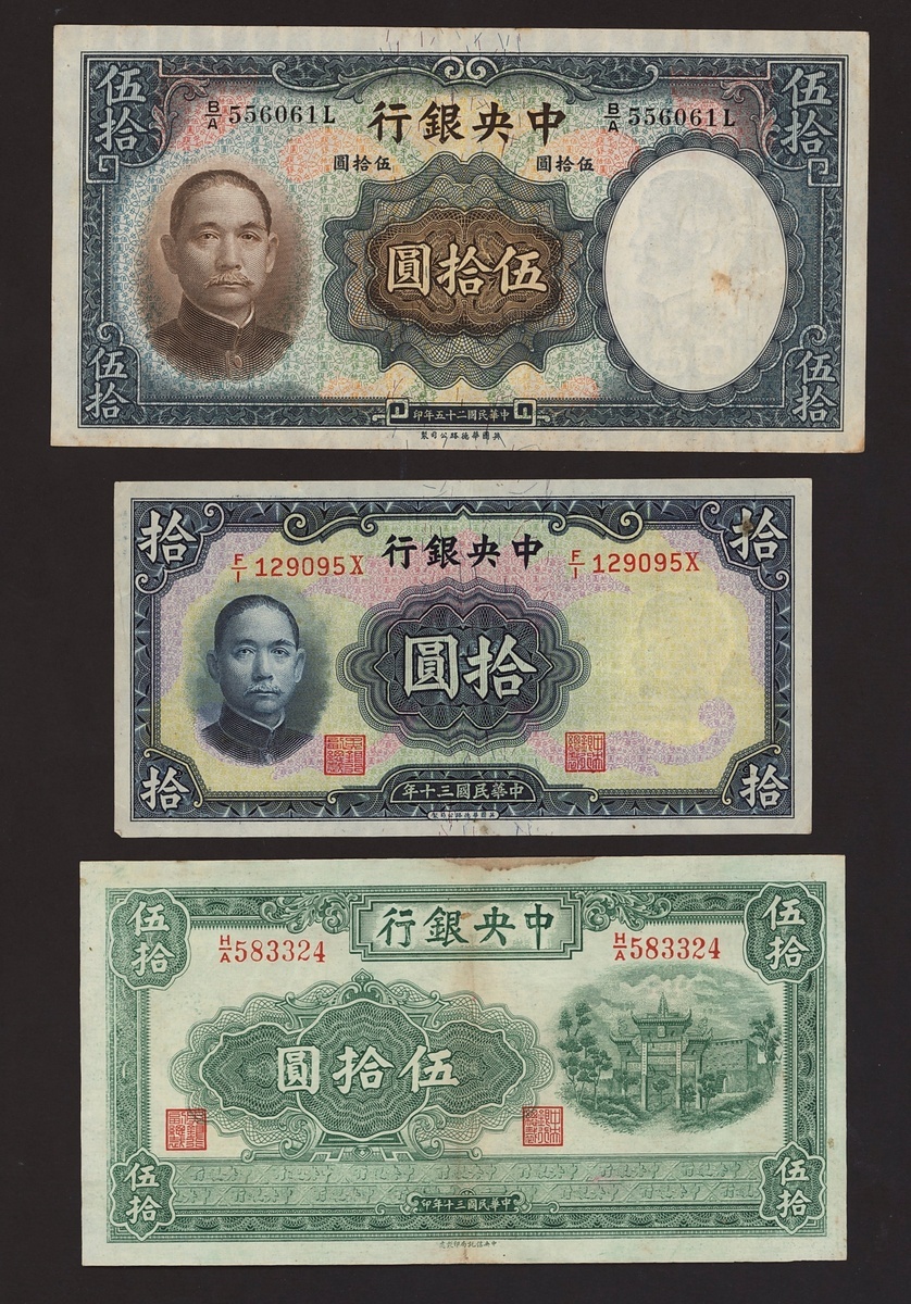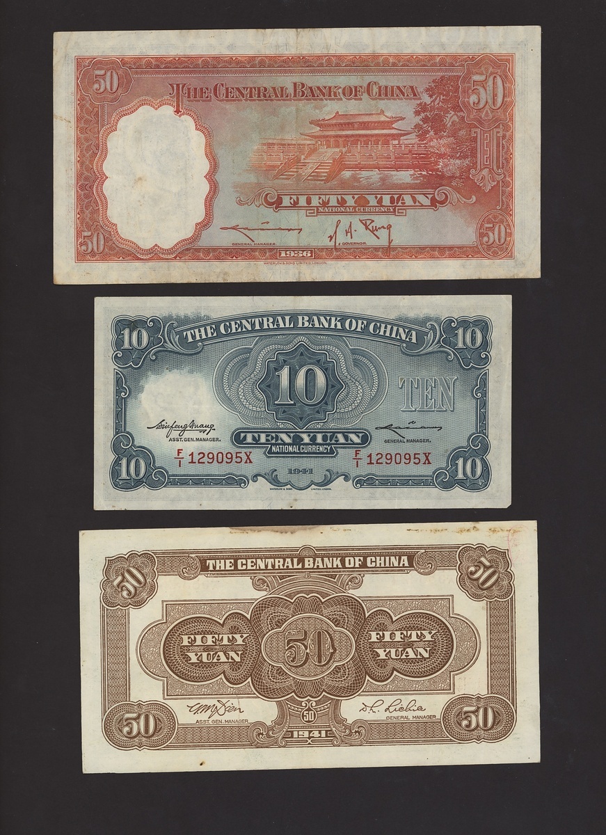 Central Bank of China, a group of 5 notes, including 50 yuan 1936, 10 yuan 1941, 500 yuan 1941, 100 yuan 1942, 100 yuan 1944,