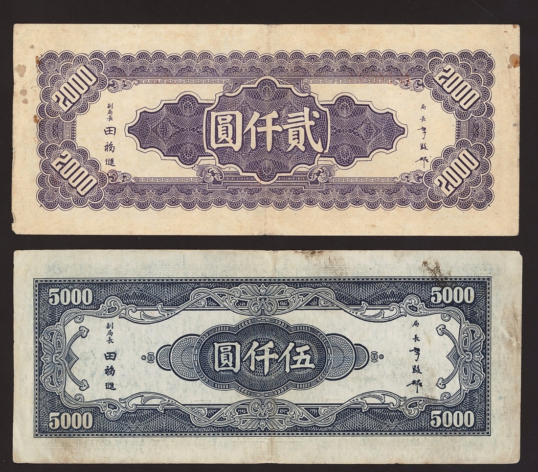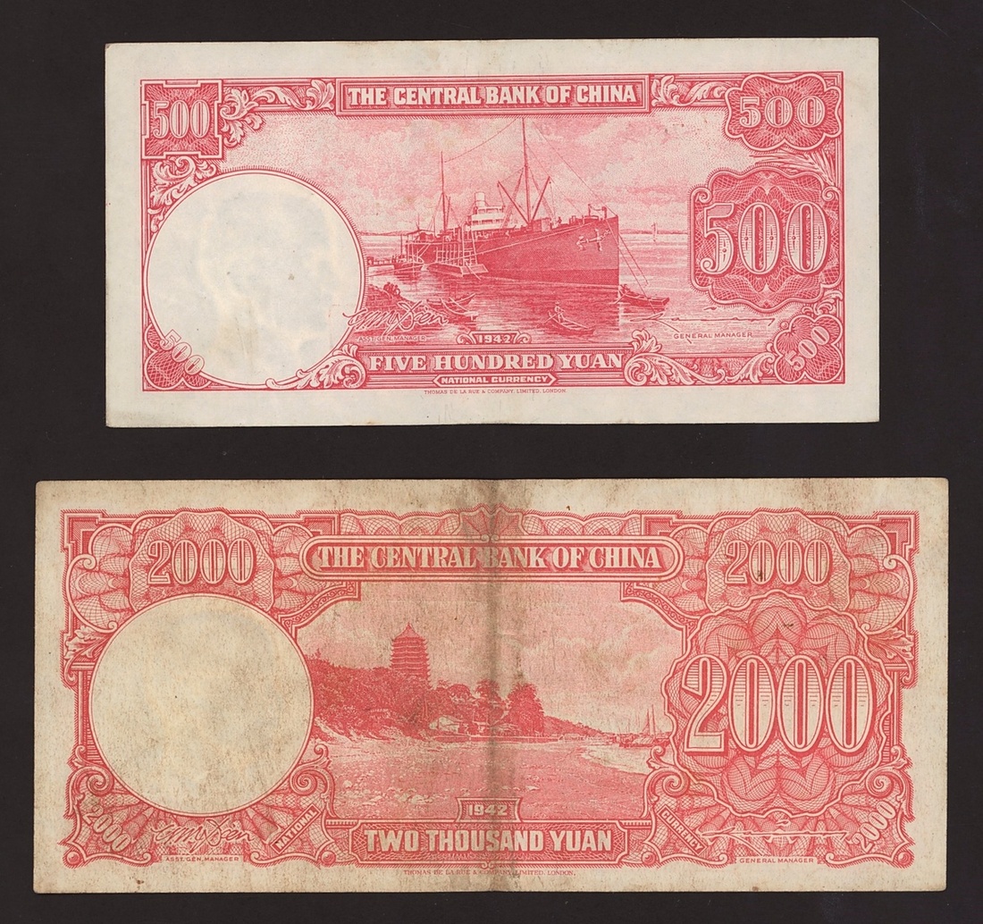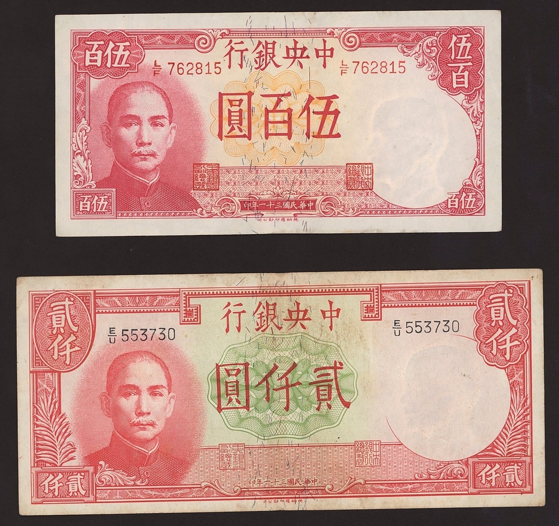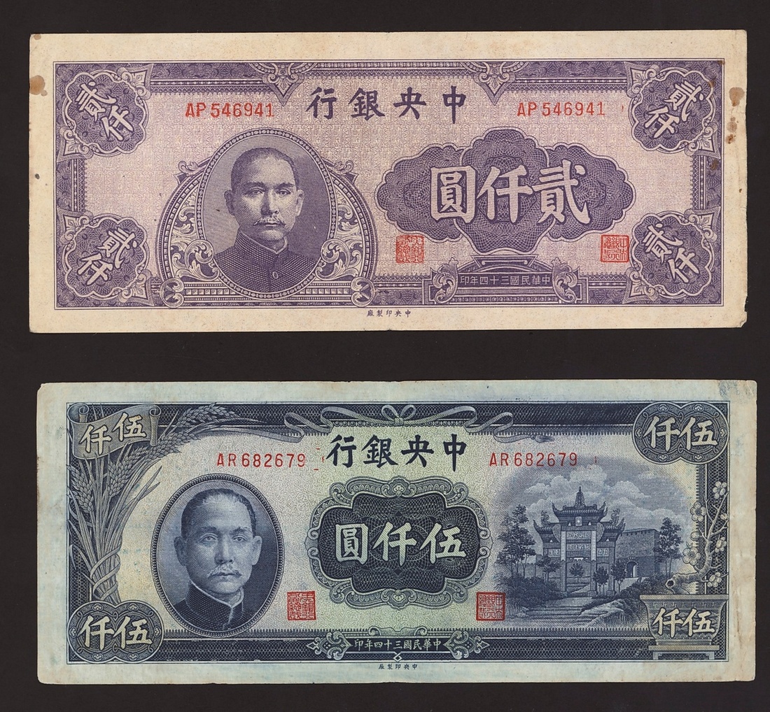 Central Bank of China, including 500 yuan 1942, 2000 yuan 1942, 2000 yuan 1945, 5000 yuan 1945,