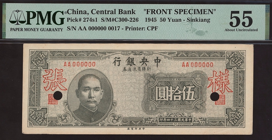 Central Bank of China, specimen 50 yuan, 1945, serial number AA 000000, uniface,