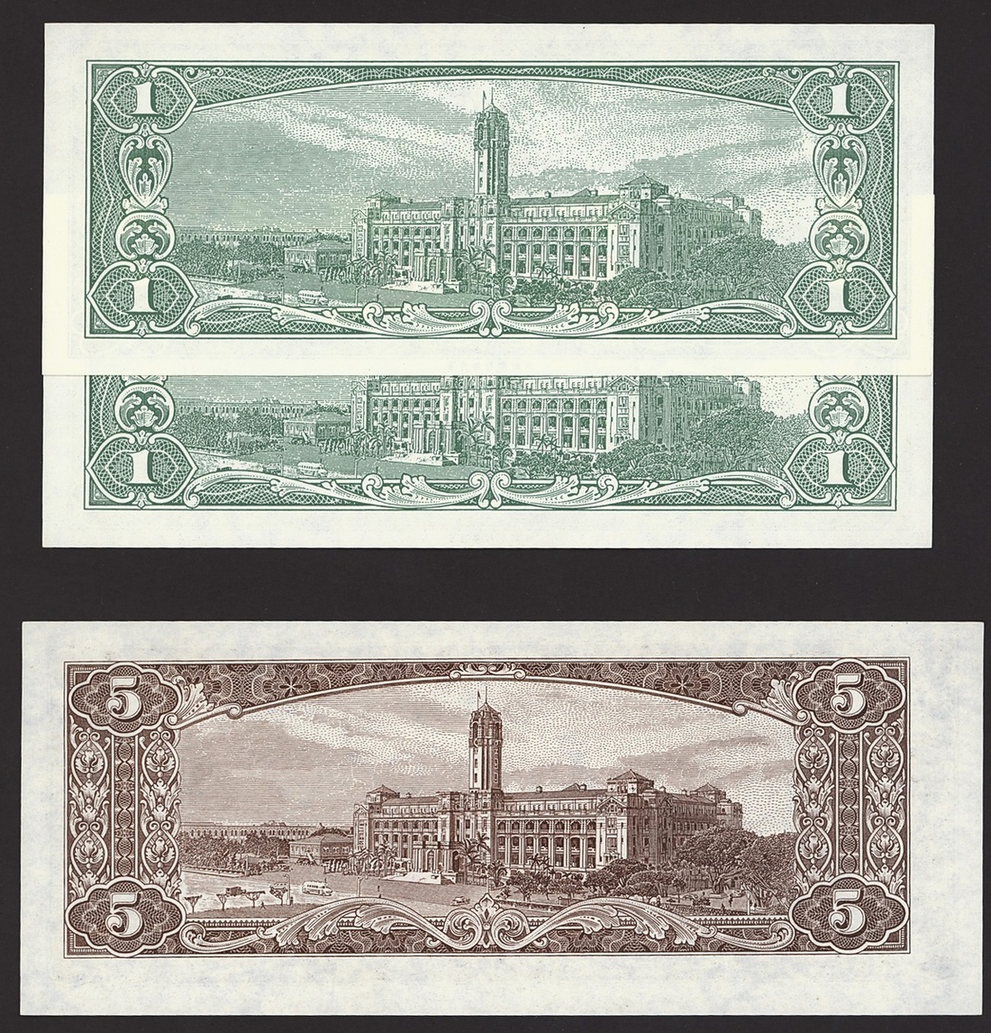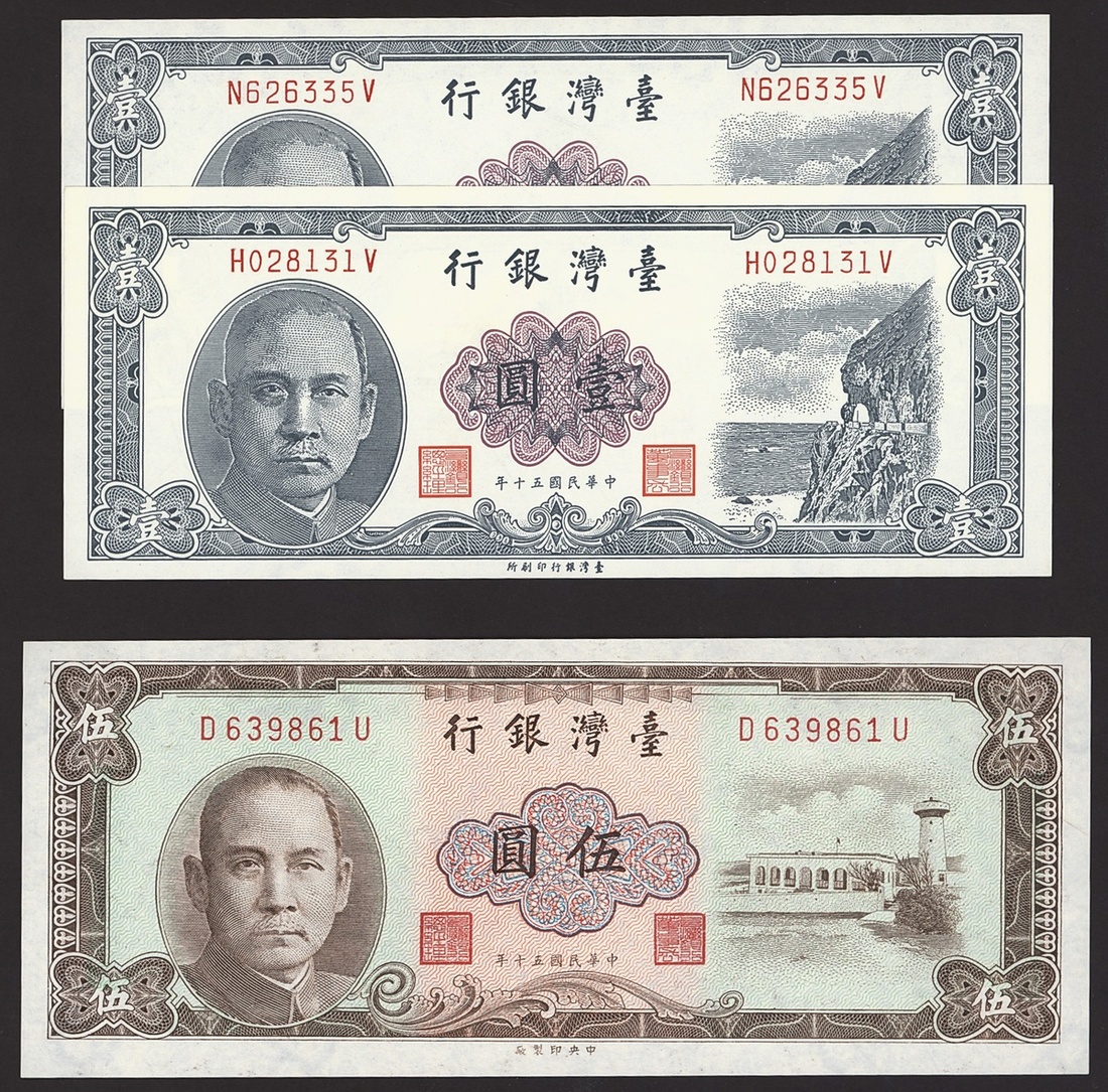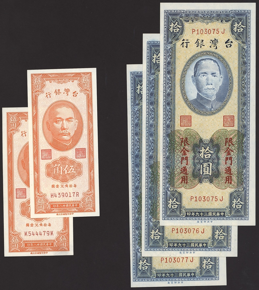 Bank of Taiwan, consecutive 10 yuan (3), Quemoy, also 50 cents (2) 1949, 1 yuan (2) 1961, 5 yuan 1961,