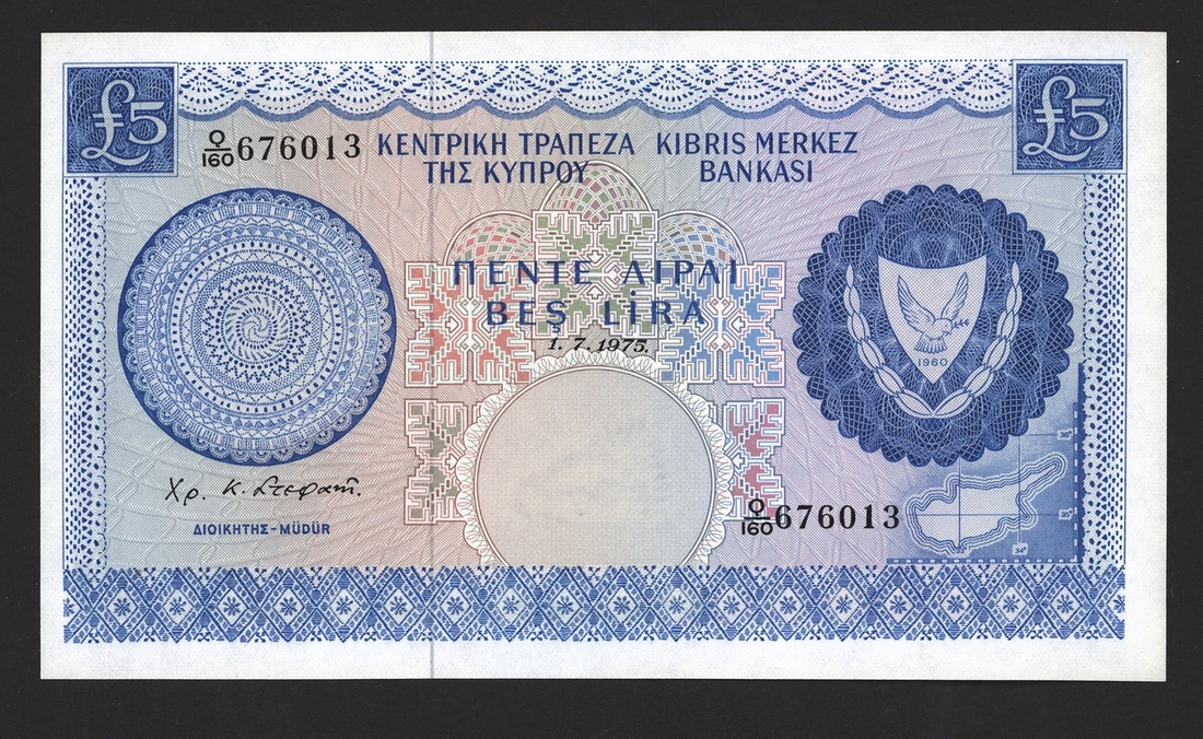 (x) Central Bank of Cyprus, £5, 1 July 1975, serial number Q/160 676013, (Pick 44c, BNB 304h), uncirculated