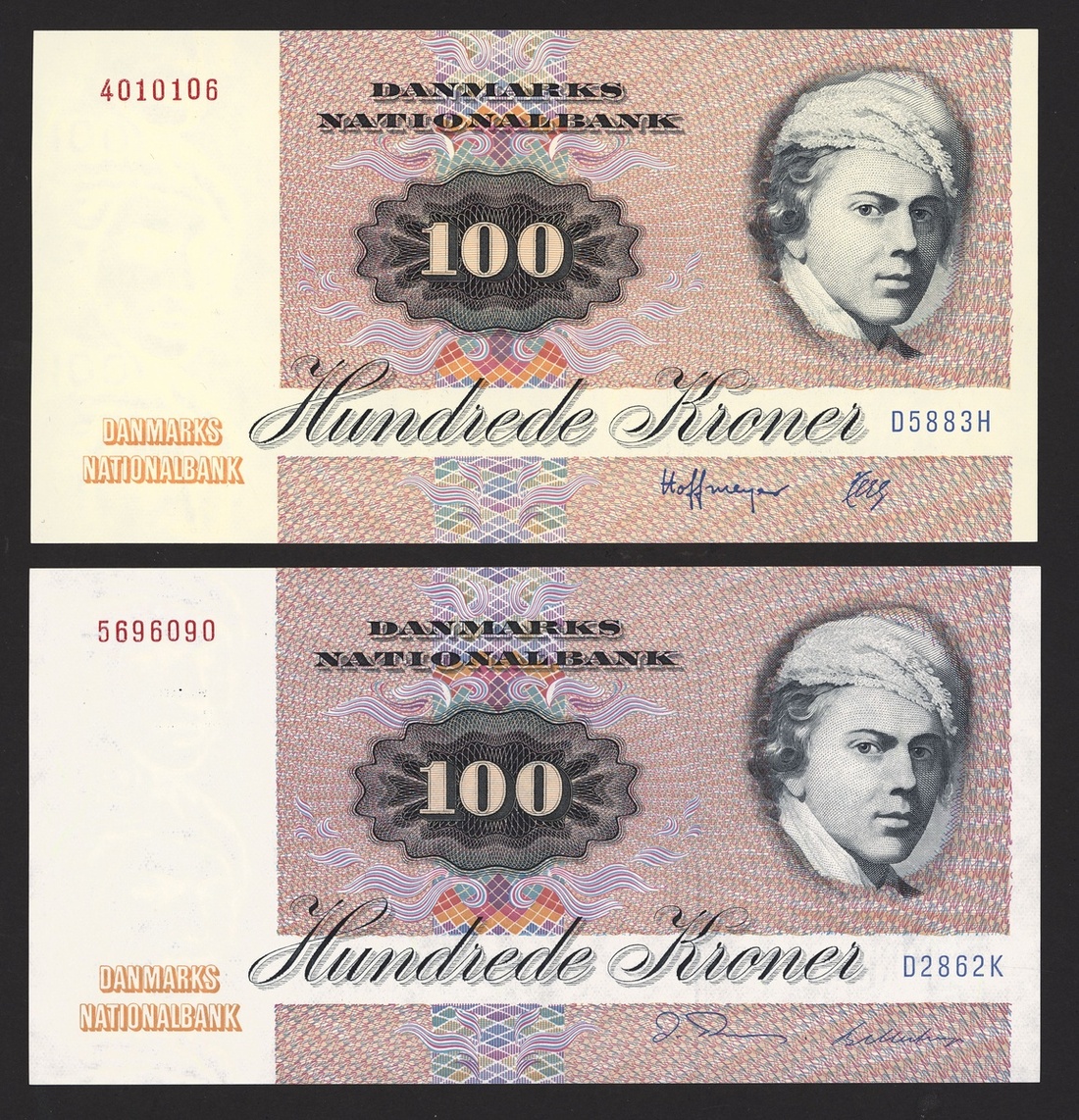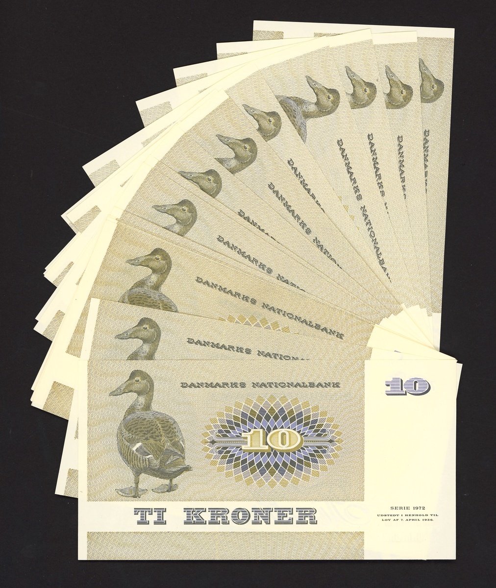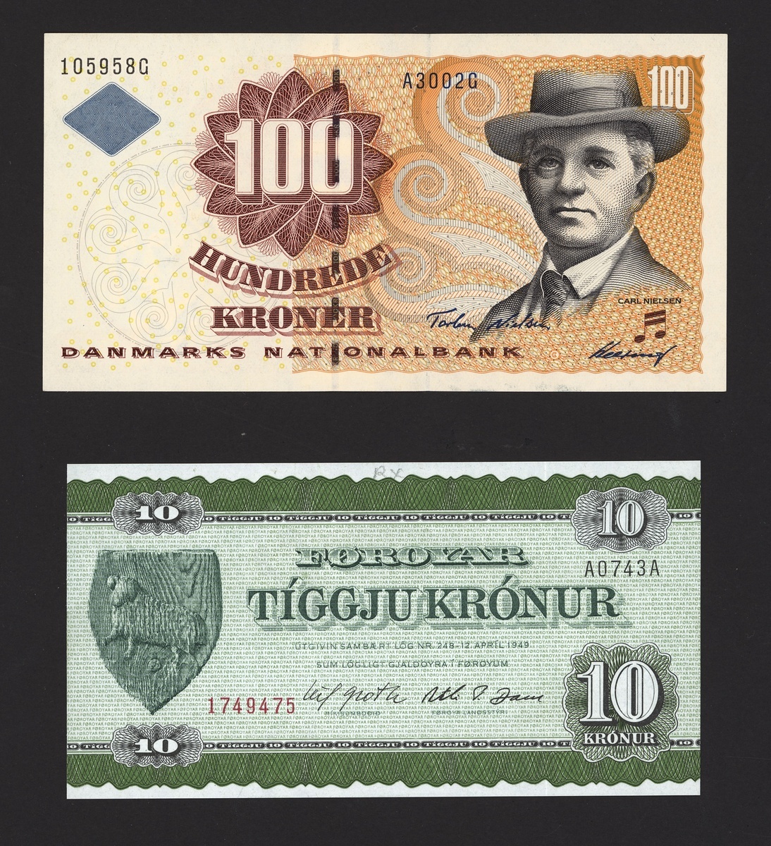(x) Danmarks Nationalbank, 10 kroner (20), 20 kroner, 100 kroner (4), 1972-98, also 100 kroner 2000, and Faeroe Island 10 kronur 1949,