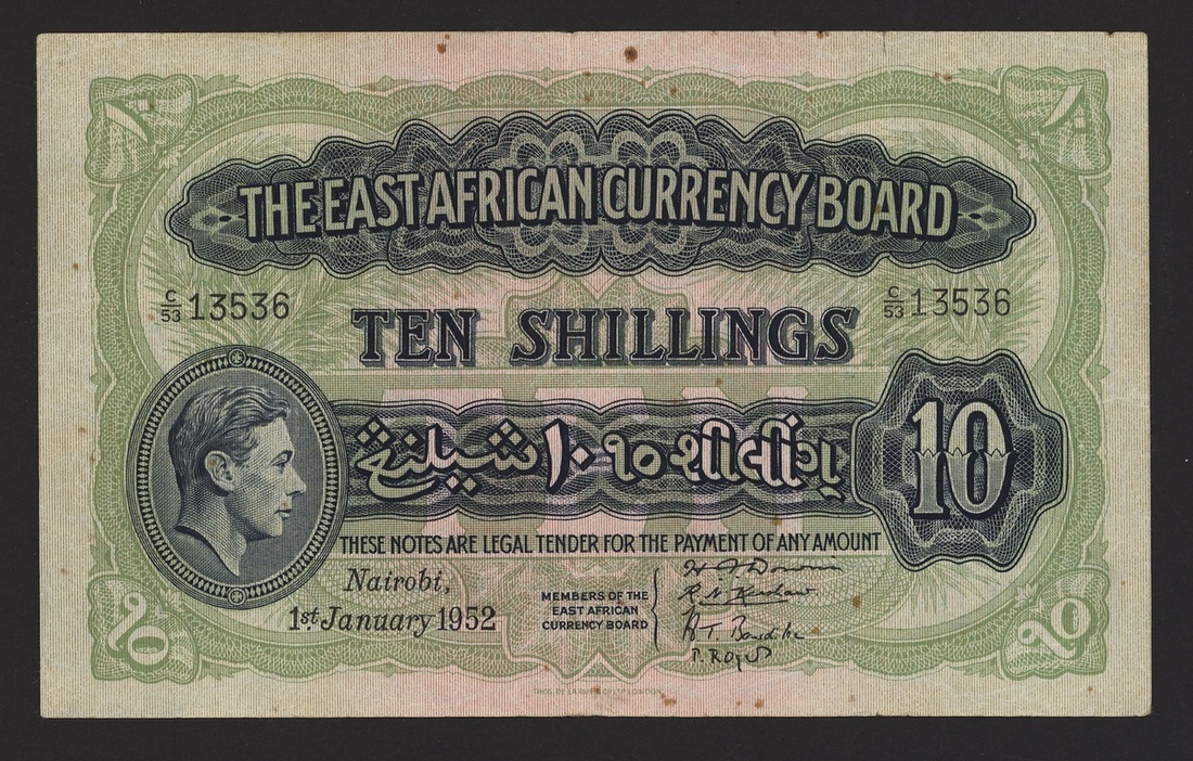 (x) East African Currency Board, 10 shillings, 1 January 1952, serial number C/53 13536, (Pick 29), last date, rust, very fine