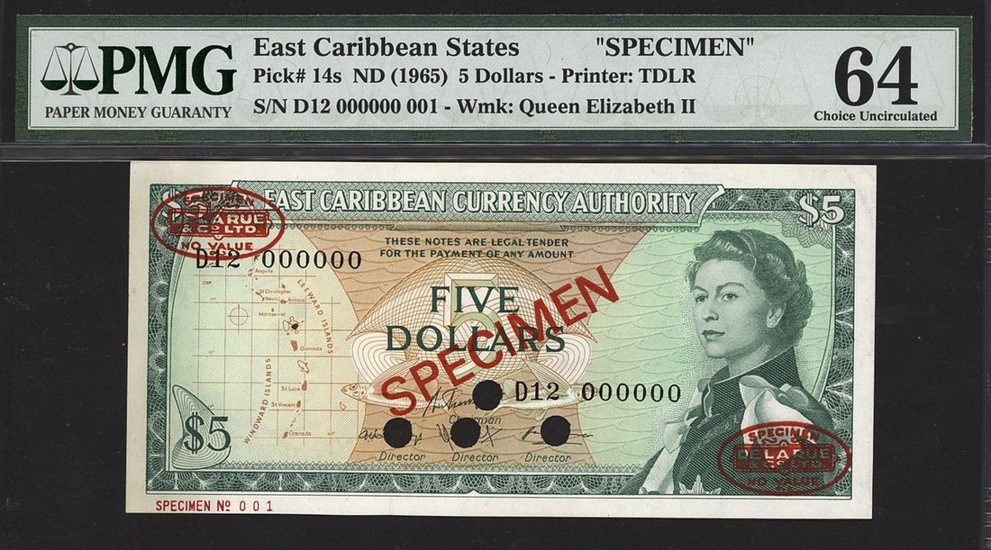 (x) East Caribbean Currency Authority, specimen $5, ND (1965), serial number D12 000000, (Pick 14s, BNB B102s), in PMG holder, previously mounted, 64 Choice Uncirculated