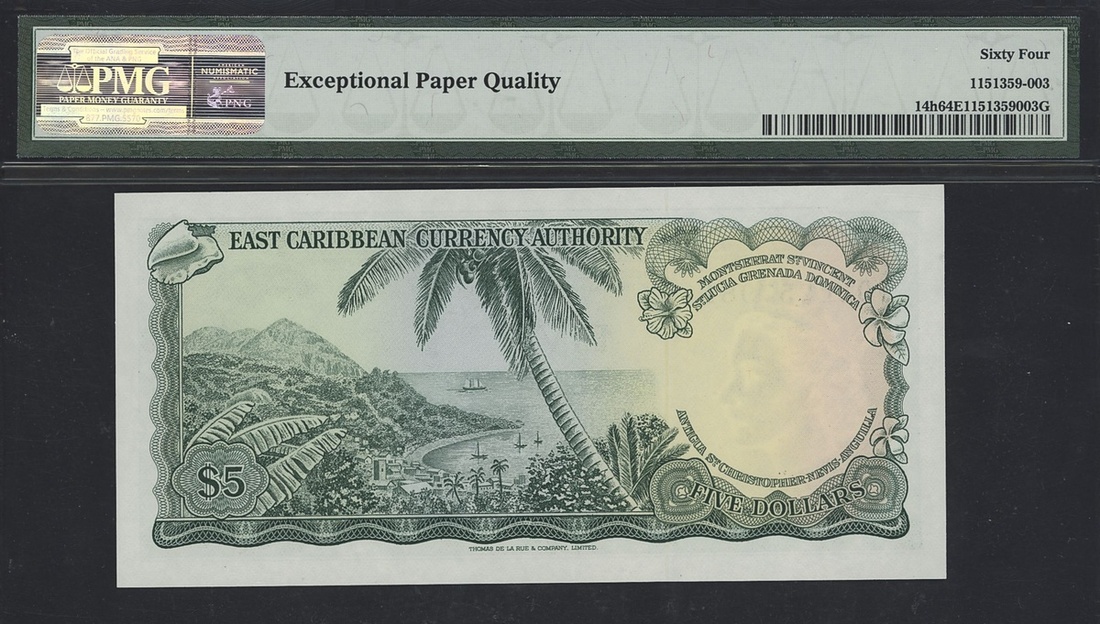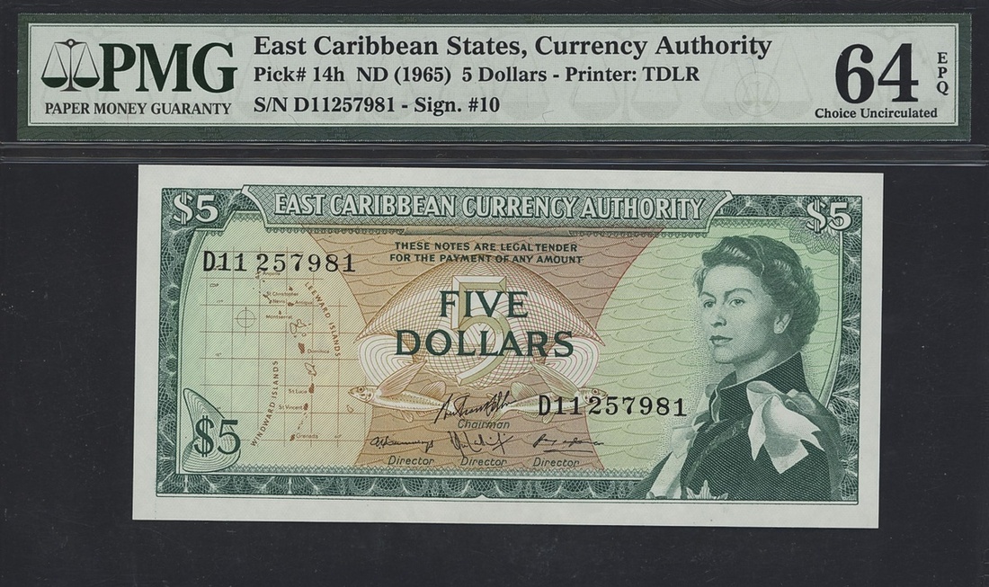 (x) East Caribbean Currency Authority, $5, ND (1965), serial number D11 257981, (Pick 14h), in PMG holder 64 EPQ Choice Uncirculated