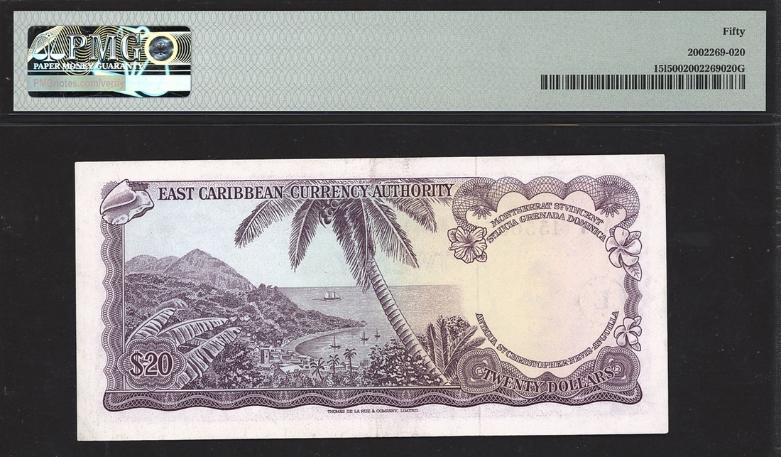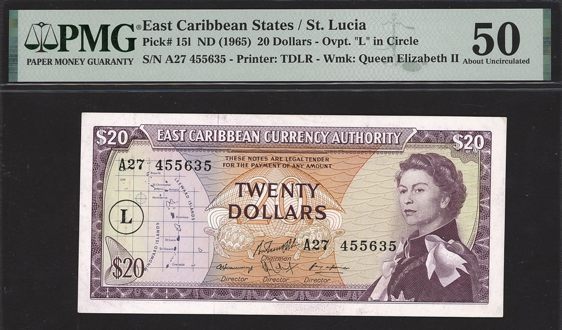 (x) East Caribbean Currency Authority, $20, ND (1965), serial number A27 455635, (Pick 15l, BNB 103cl), in PMG holder 50 About Uncirculated