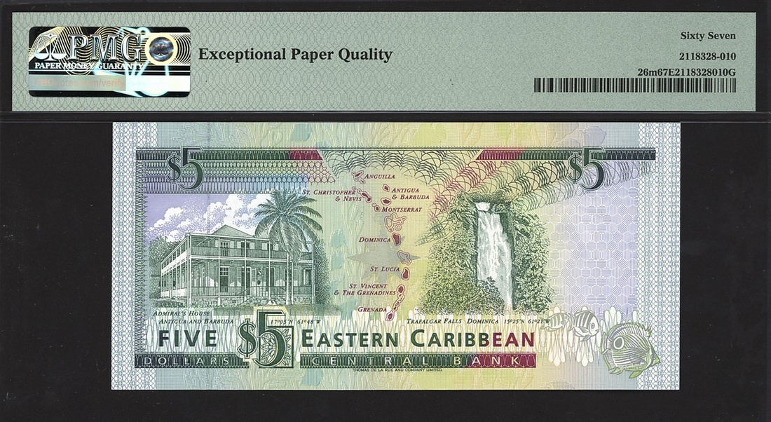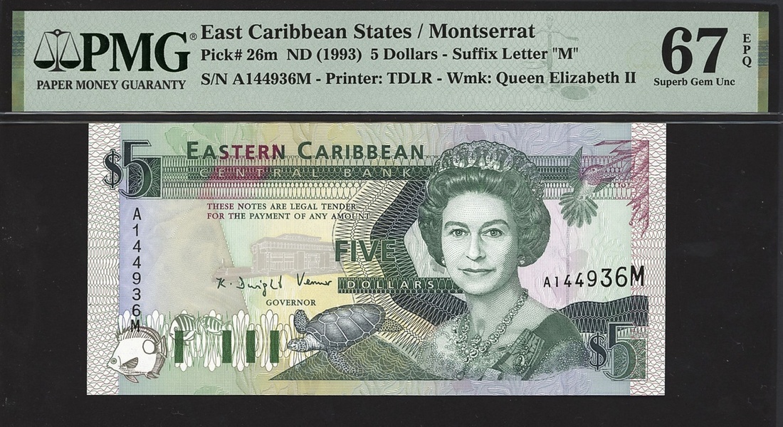 (x) Eastern Caribbean Central Bank, $5, ND (1993), Montserrat, serial number A144936M, (Pick 26m, BNB 210m), in PMG holder 67 EPQ Superb Gem Unc
