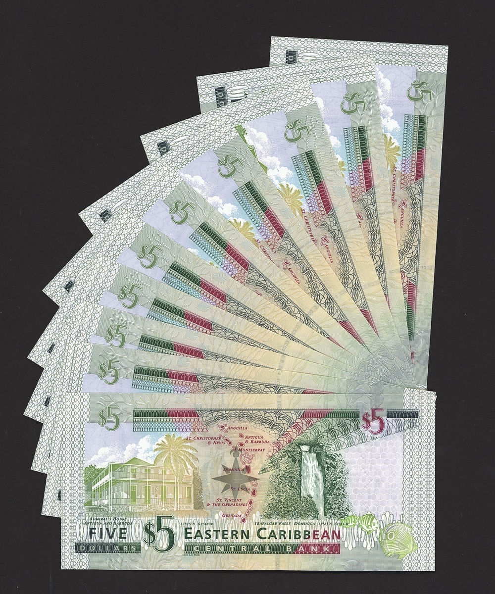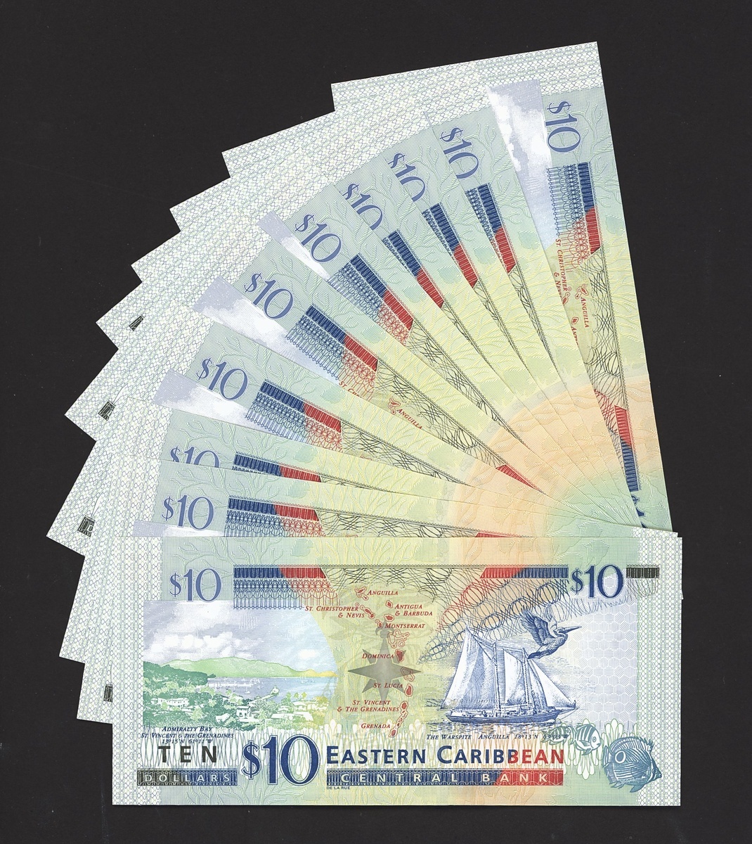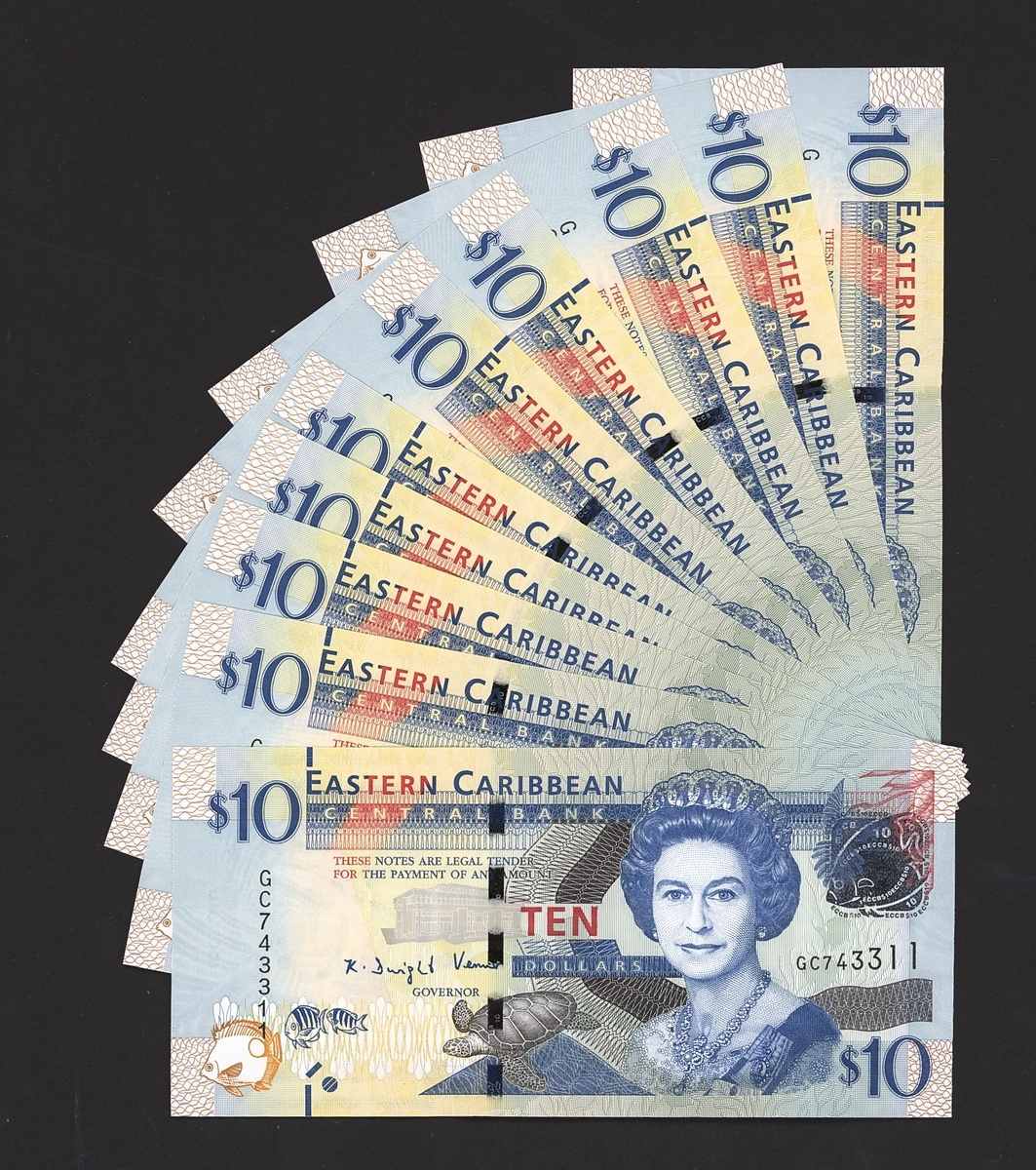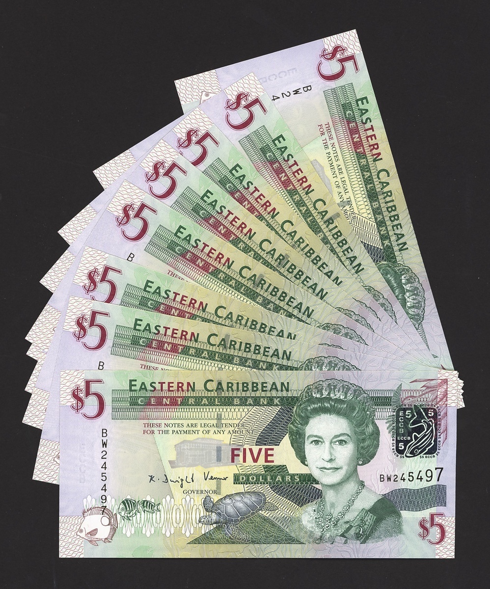 (x) Eastern Caribbean Central Bank, $5 (10), $10 (10), ND (2008-2012), prefixes BW, GC, (Pick 47, 52), crisp uncirculated (20 notes)