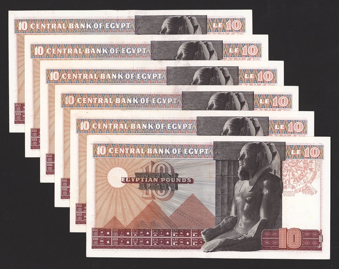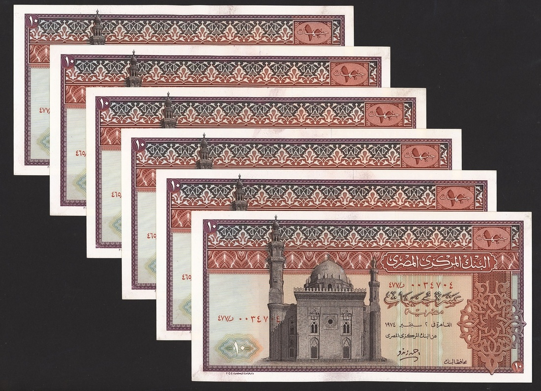 (x) Central Bank of Egypt, £10 (6), 1974, (Pick 46b), light fold at centre, about uncirculated (6 notes)