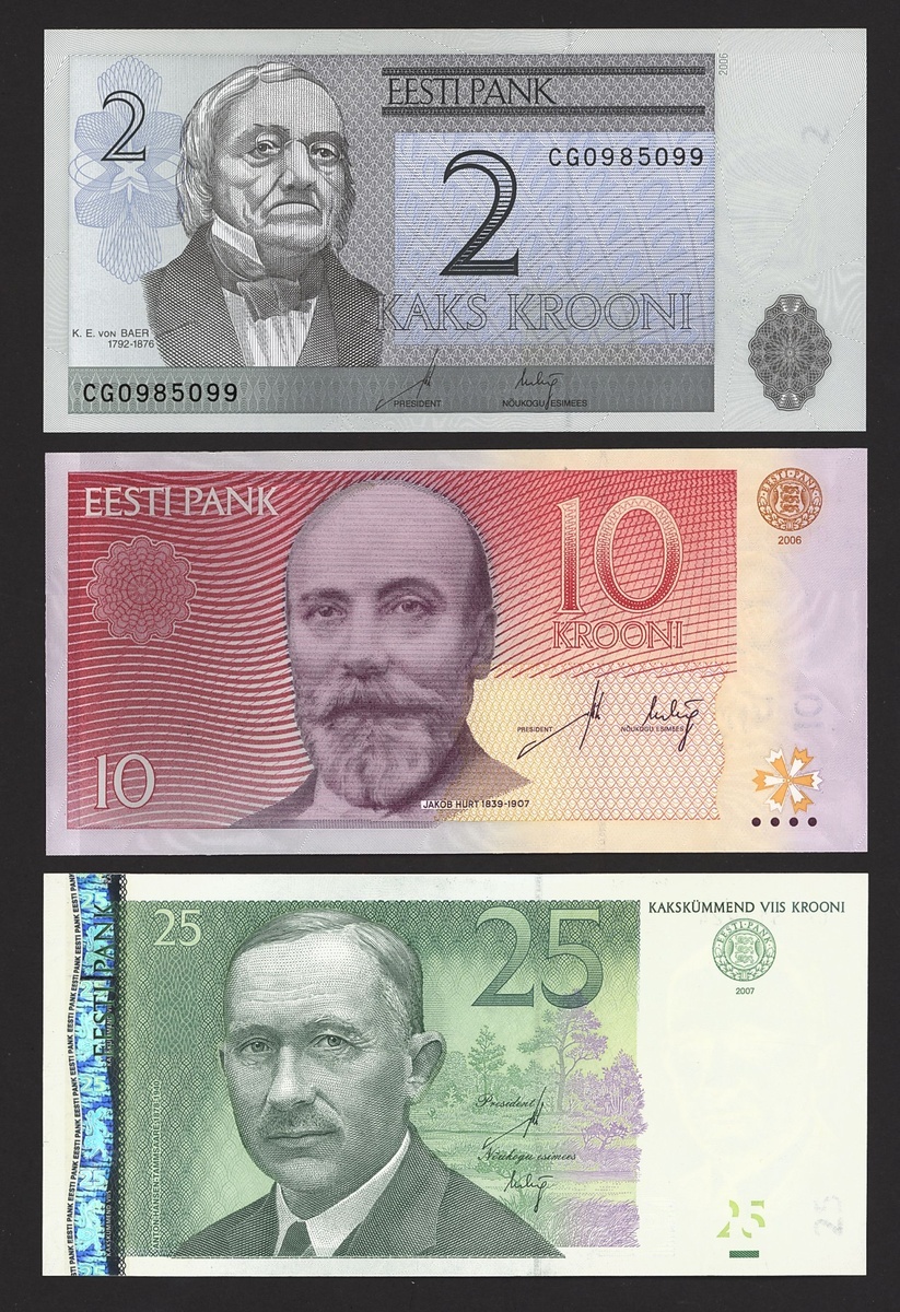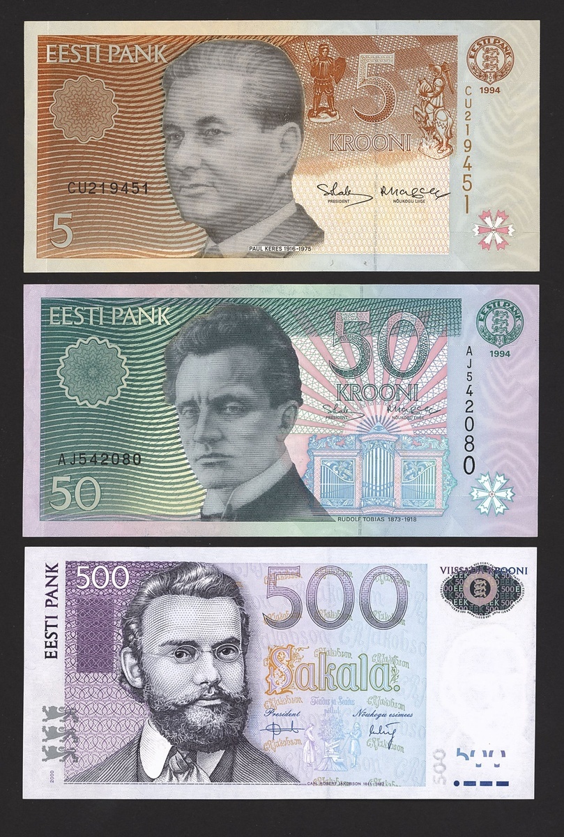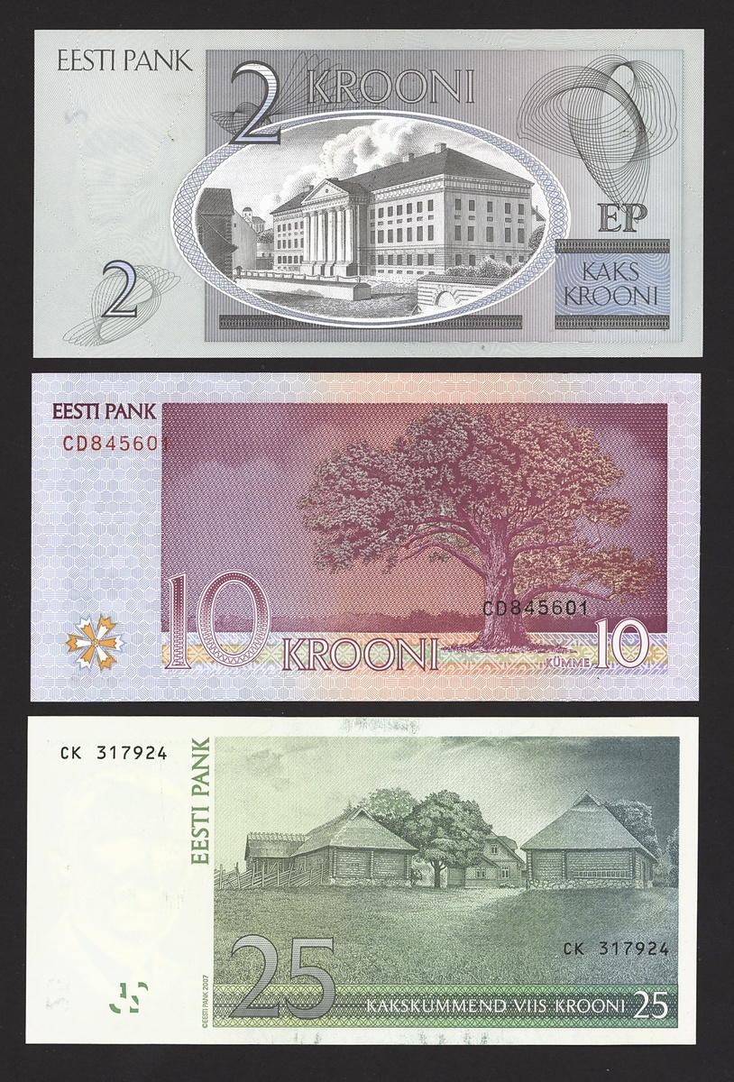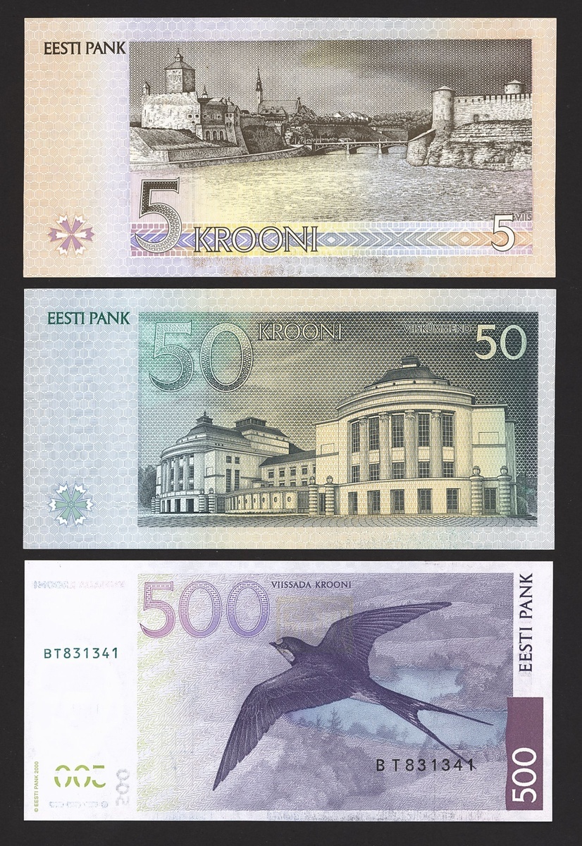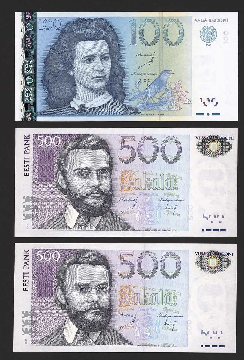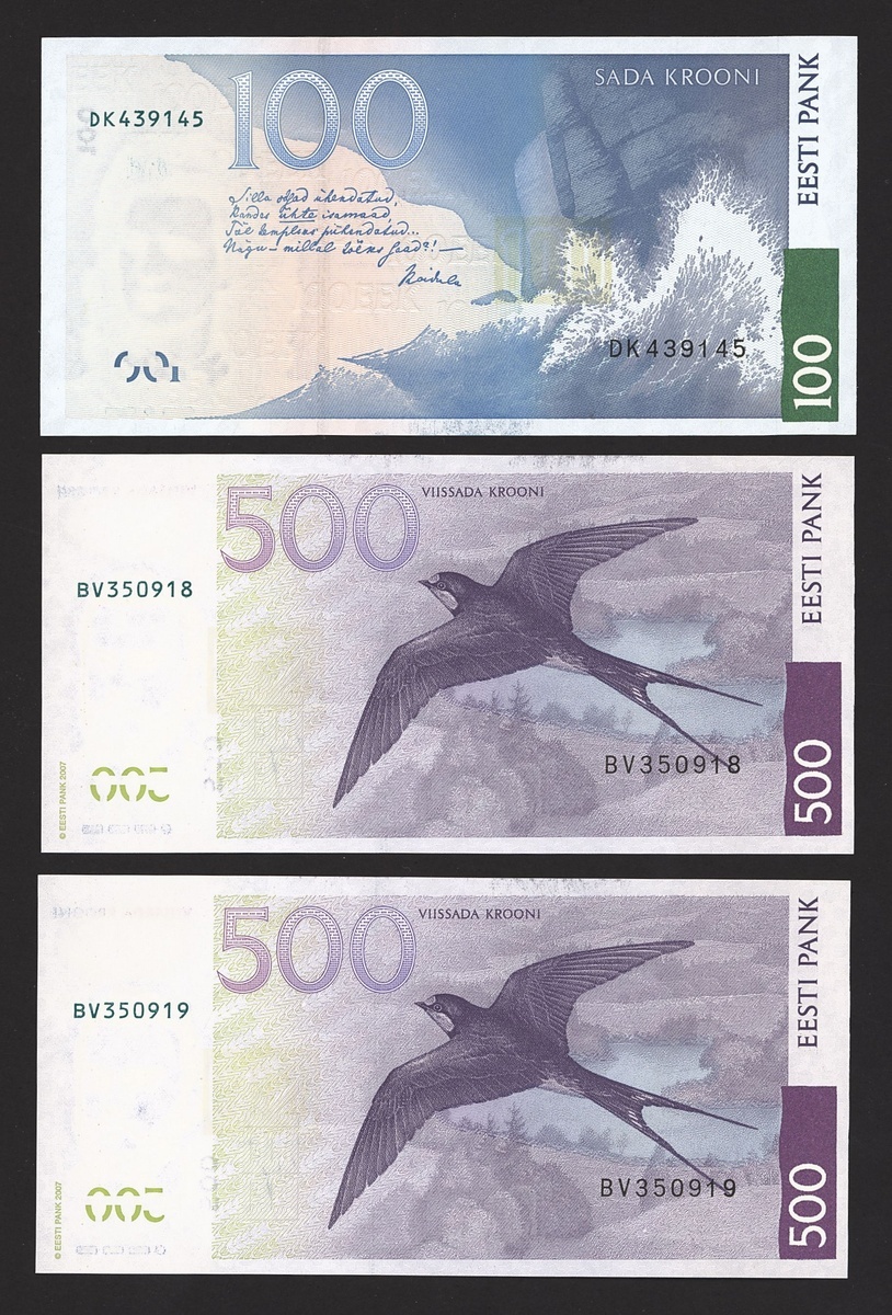 (x) Eesti Pank, Estonia, a group including, 5 krooni 1994, 50 krooni 1994, 500 krooni 2000, 2 krooni 2006, 10 krooni 2006, 25 krooni 2007, 100 krooni 2007, 500 krooni (2) 2007