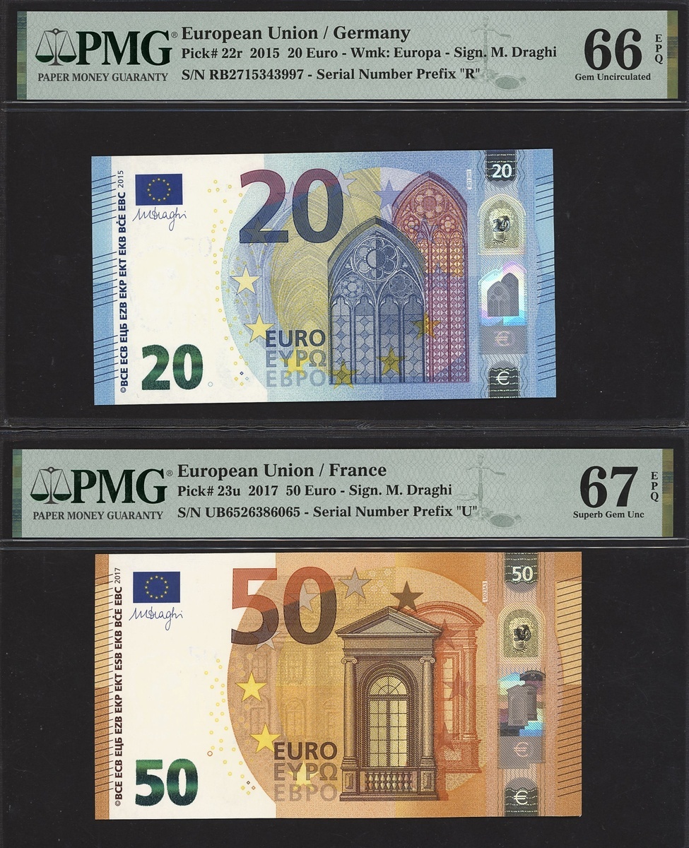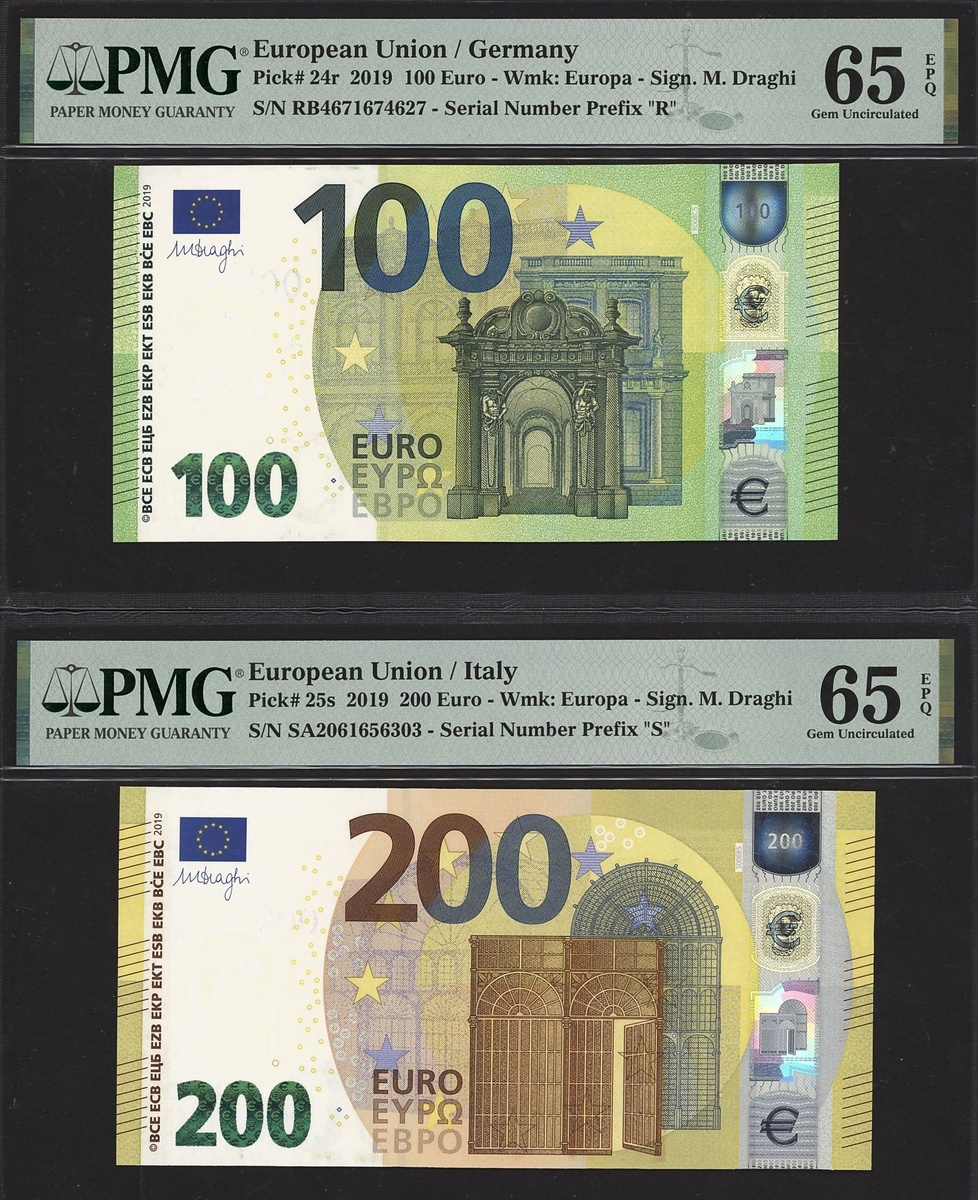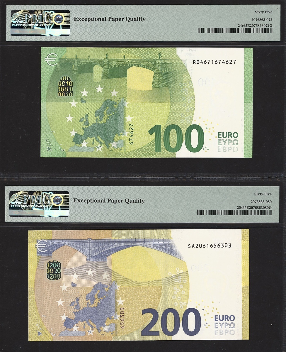 (x) European Central Bank, a partial set of the 2013-19 issue, including 5 euro Spain 2013, 10 euro Austria 2014, 20 euro Germany 2015, 50 euro France 2017, 100 euro Germany 2019, 200 euro Italy 2019,