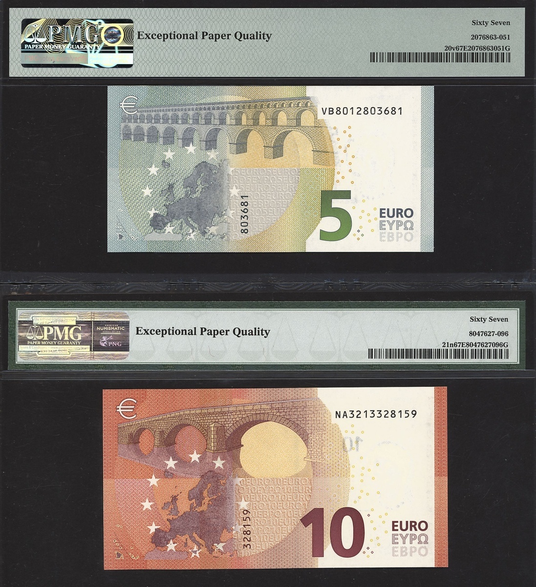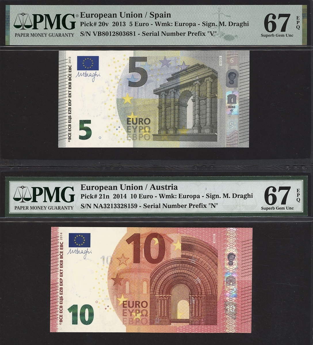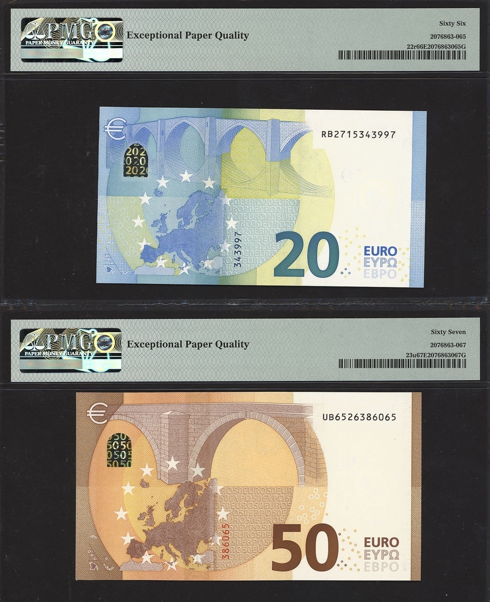 (x) European Central Bank, a partial set of the 2013-19 issue, including 5 euro Spain 2013, 10 euro Austria 2014, 20 euro Germany 2015, 50 euro France 2017, 100 euro Germany 2019, 200 euro Italy 2019,