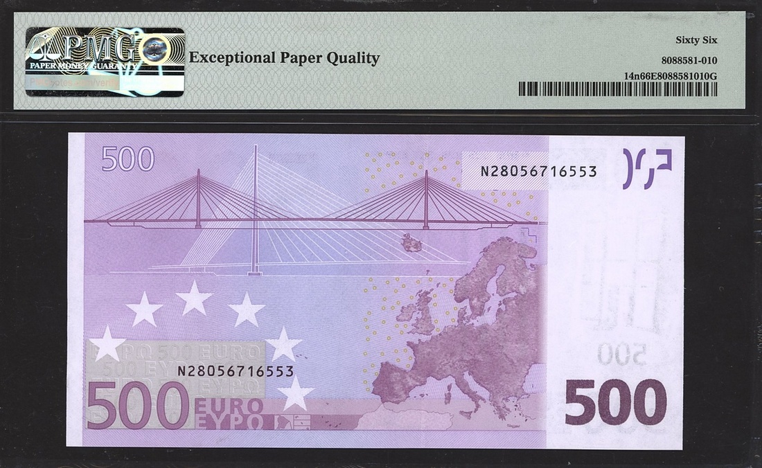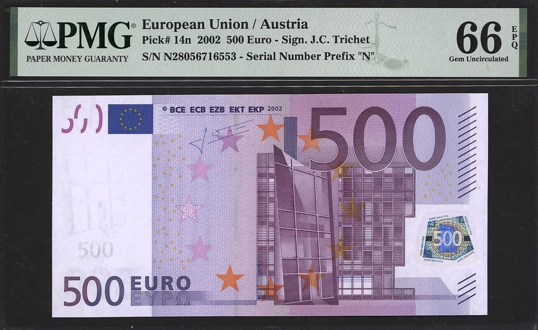 (x) European Central Bank, 500 euro, Austria, 2002, serial number N28056716553, (Pick 14n), in PMG holder 66 EPQ Gem Uncirculated