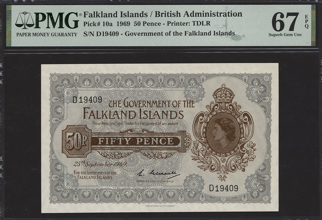(x) Government of The Falkland Islands, 50 pence, 25 September 1969, serial number D19409, (Pick 10a, BNB 215a), in PMG holder 67 EPQ Superb Gem Unc