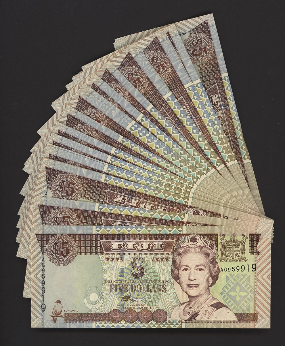 Reserve Bank of Fiji, a bundle of $5 (100), ND (2002), serial numbers AG959901-960000, (Pick 105, BNB 516), with some interesting serials, last prefix, minor handling, about uncirculated (100 notes)