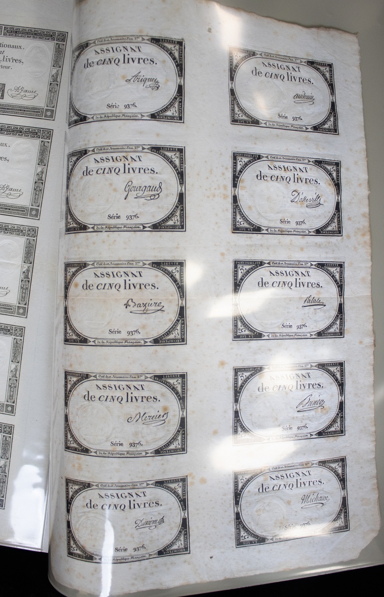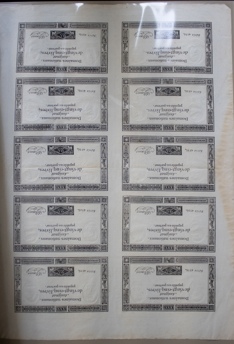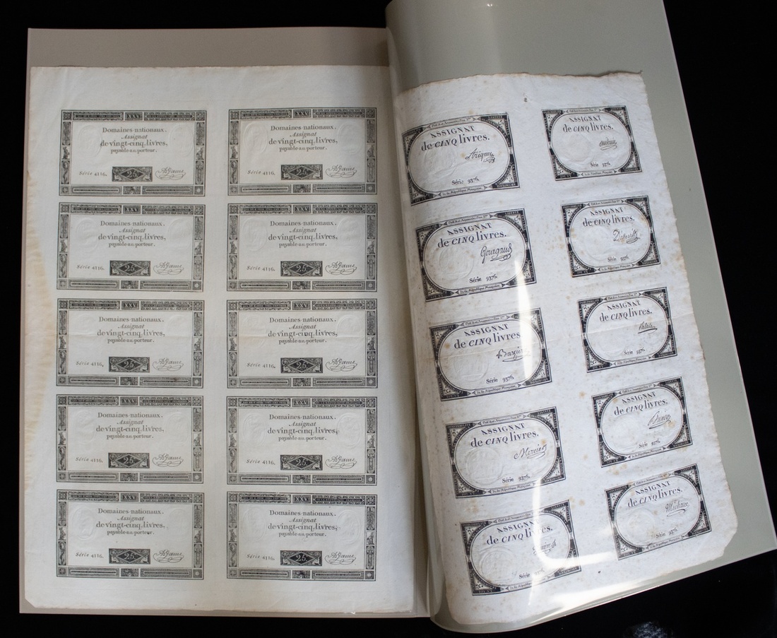 A group of early Assignat notes, comprised of the following, 400 livres 1792, 50 livres 1792 (2), 50 livres 1790, 100 livre 1791, 50 sols 1793, 25 sols, 200 livre 1793-94, 25 livres (sheet of 10), 10 livres (sheet of 10), Quitance de Contribution Mobilaire