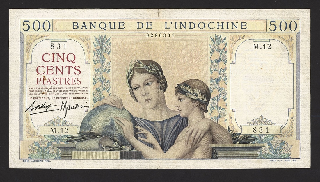 (x) Banque de l'Indochine, 500 piastres, ND (1939), serial number M.12 831, (Pick 57), usual staple holes, pinholes, minor split at top margin, about very fine