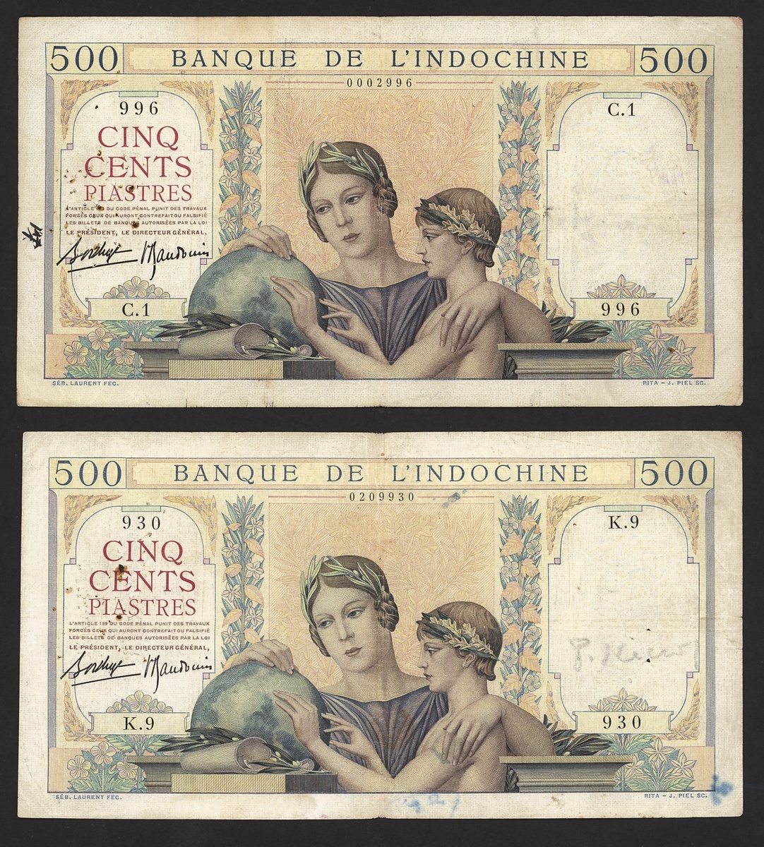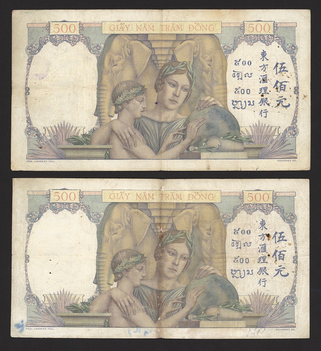 Banque de l'Indochine, French Indo-China, 500 francs (3), ND (1939), (Pick 57), pinholes, fine (3 notes)