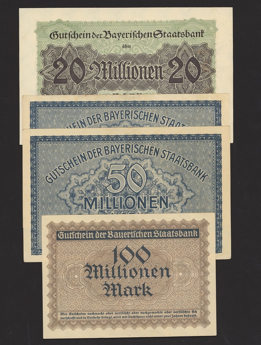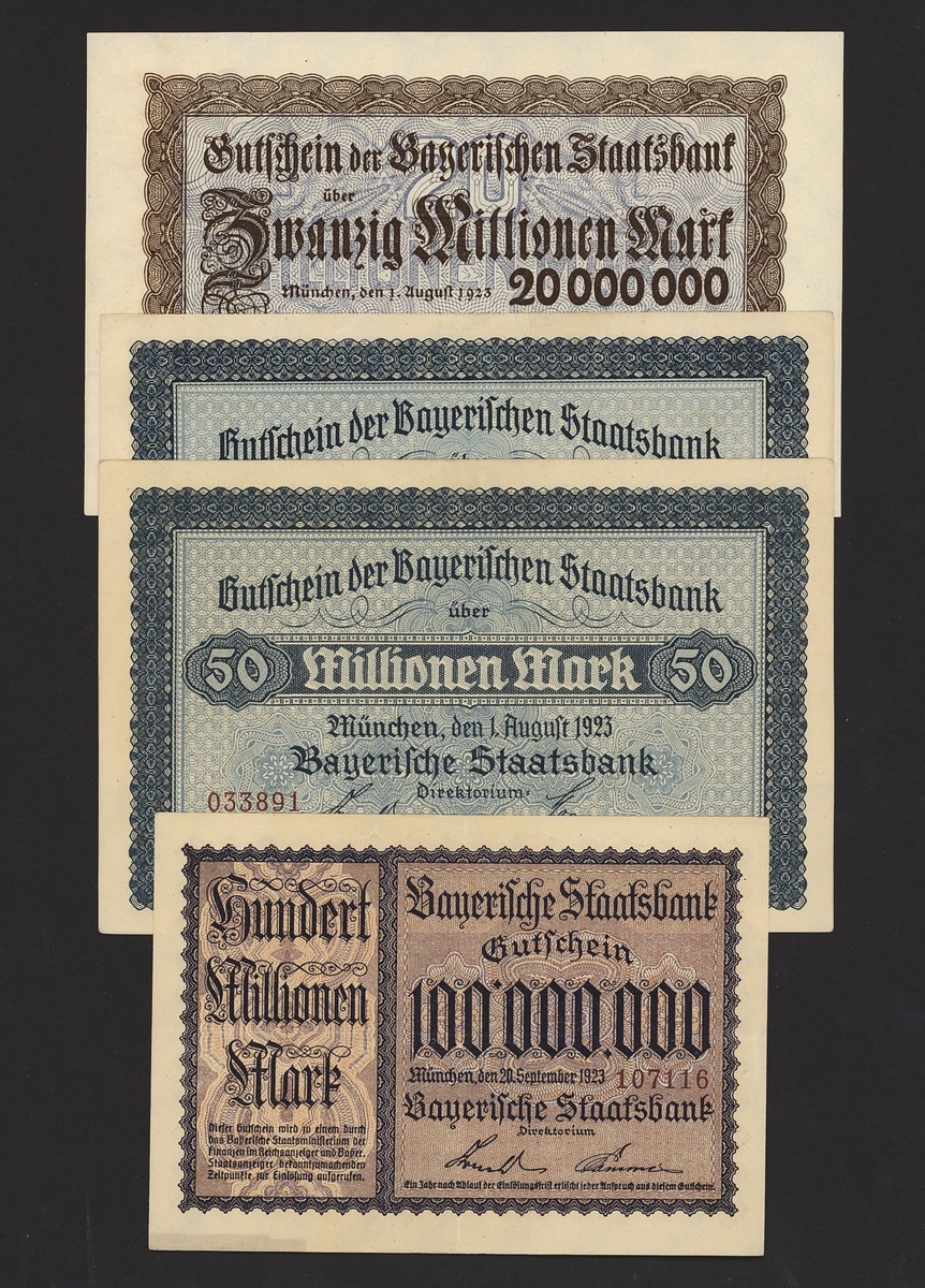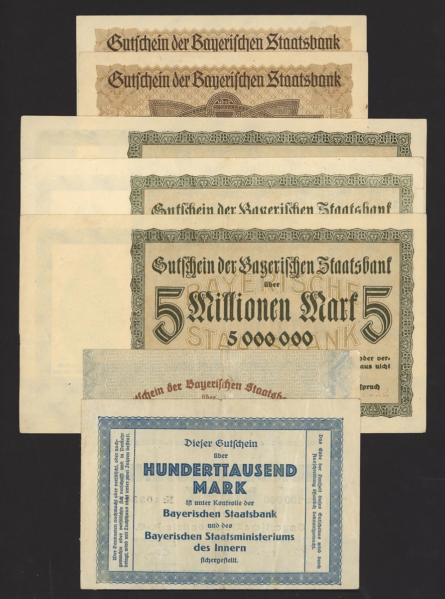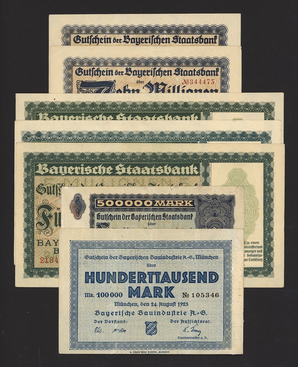 A group of Bavarian State Bank notes, Germany, all dated 1923, including 100,000 mark,, 500,000 mark, 5 million mark (2), 10 million mark (2), 20 million mark, 50 million mark (2), 100 million mark,