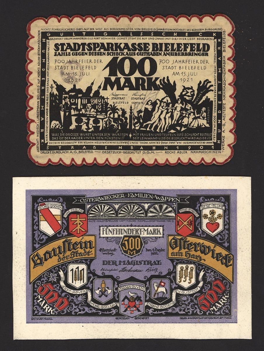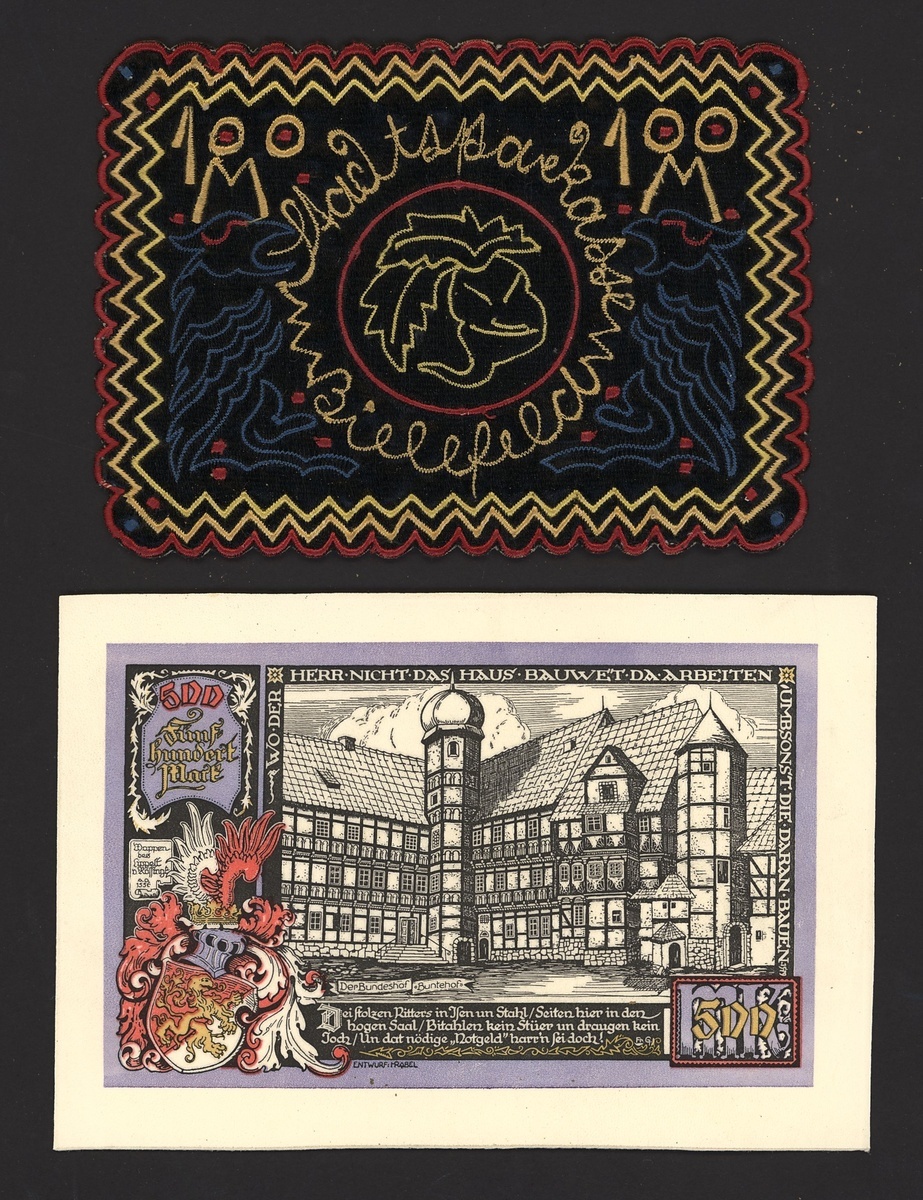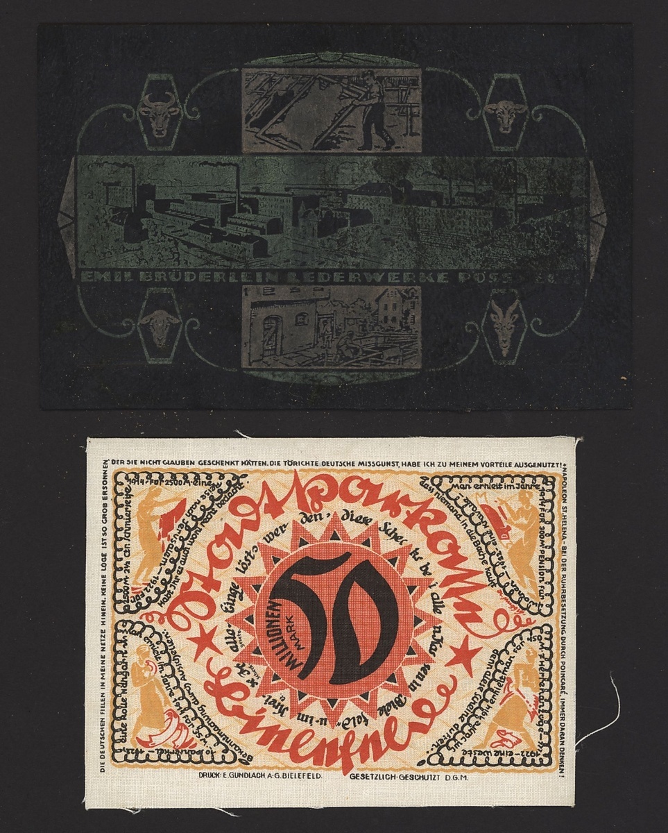 A group of fabric Notgeld, including Bielefield 50 million mark, Possneck 50 million mark 1923, Stadtsparkasse Bielefeld 100 mark 1921, Osterwieck 500 mark 1922,