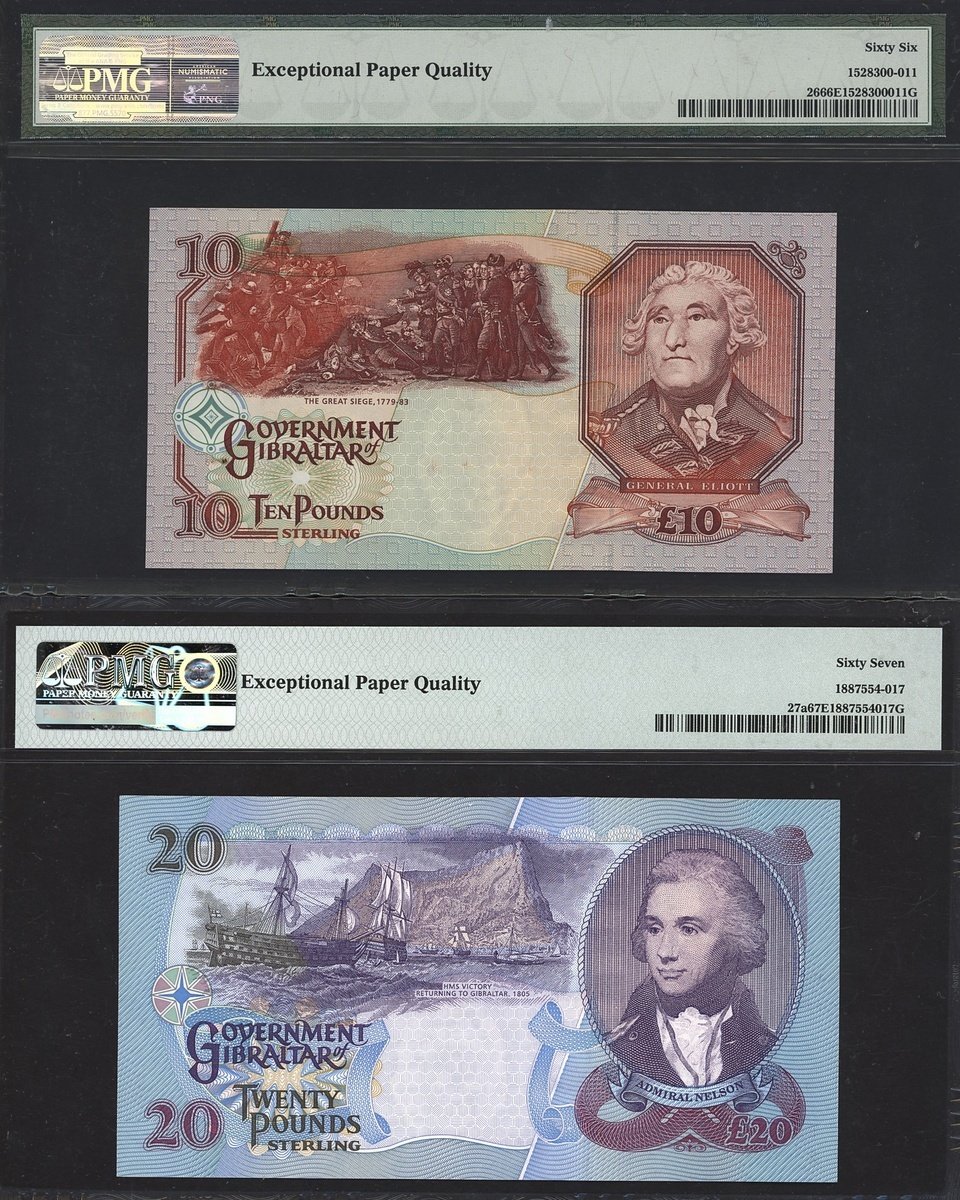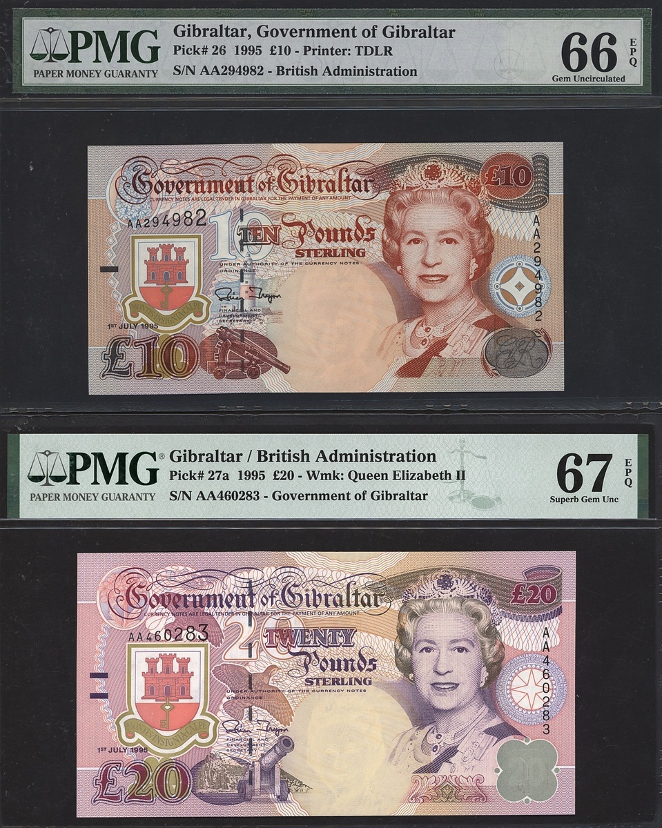 (x) Government of Gibraltar, A pair of £10 & £20 notes, 1995, (Pick 26, 27a), In PMG holder 66 EPQ Gem Unc (1), 67 EPQ Superb Gem Uncirculated (1) (2 notes).
