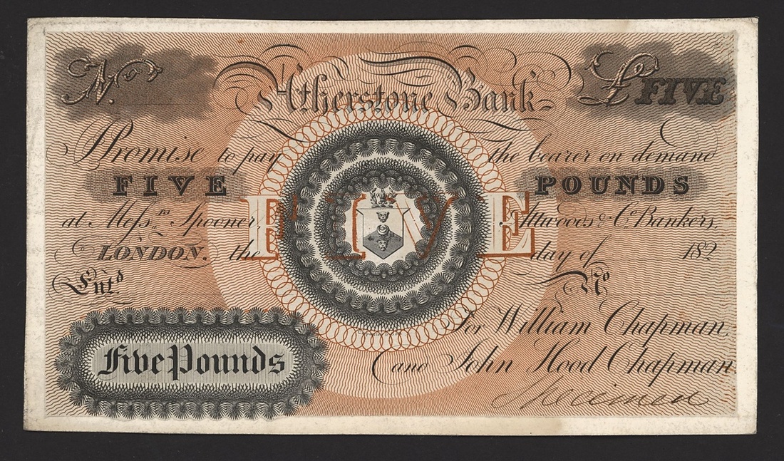Atherstone Bank, (William, and John Hood Chapman), proof £5, 182- (c.1829), uniface, black on orange, arms at centre,