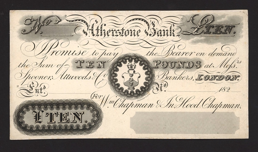 Atherstone Bank, (Chapman & Chapman), proof £10, 182-, ca (1829), uniface, black and white, bank logo at centre,