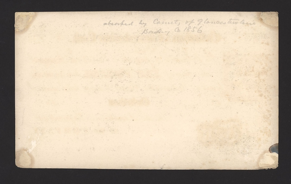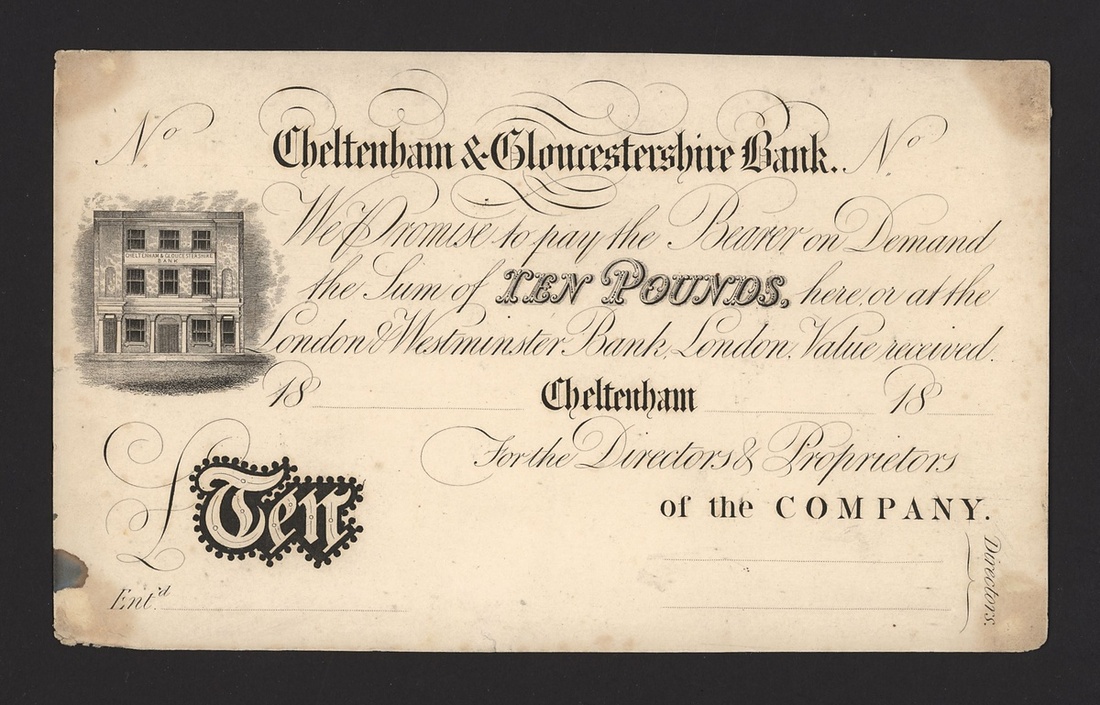 Cheltenham & Gloucestershire Bank, proof for an unissued £10, 18-. uniface, black and white, bank building at left,