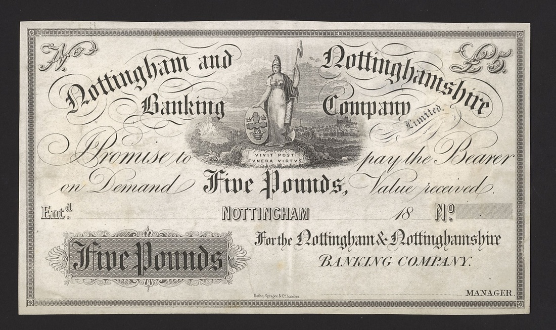 Nottingham & Nottinghamshire Banking Company Limited, proof £5, 18- (1884-1919), no serial numbers, uniface,