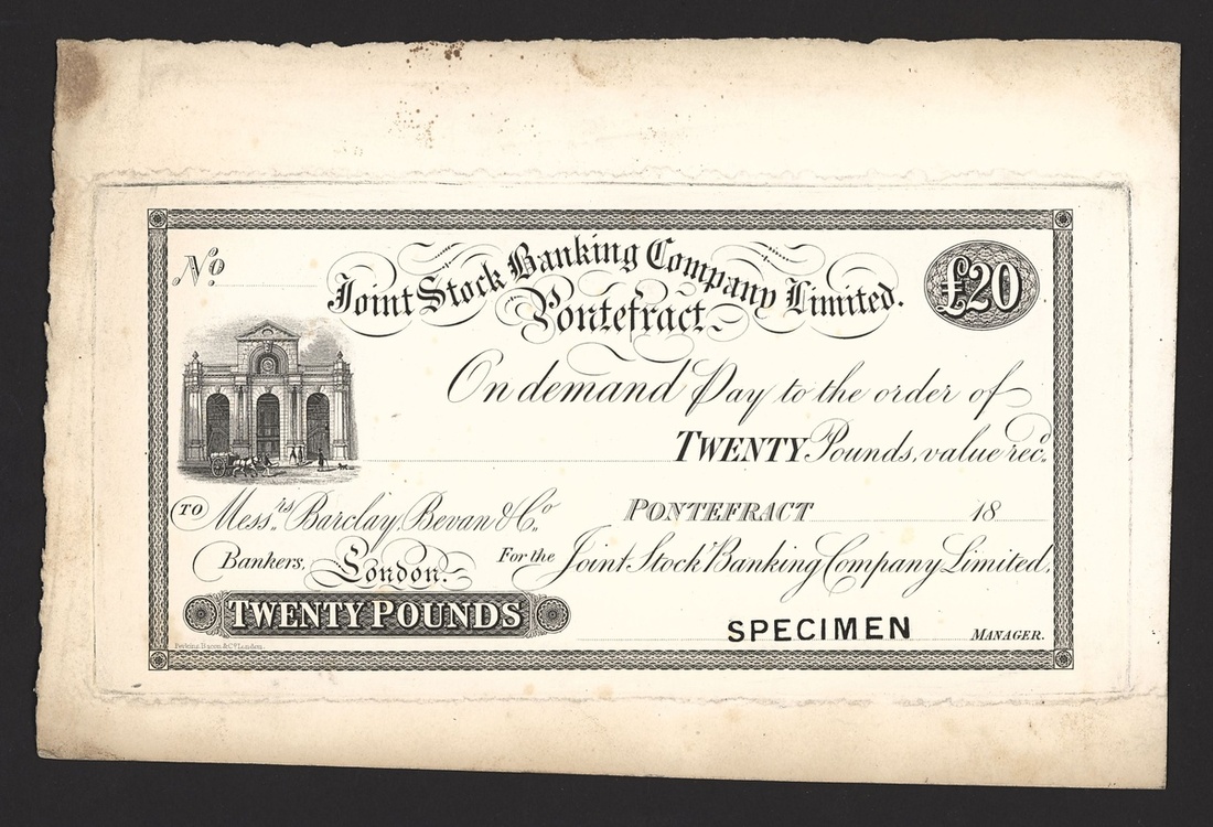 Joint Stock Banking Company, Pontefract, (Mess, Barclay, Bevan & Co.), proof for an unissued £20, 18- (1861-62), no serial numbers, uniface, black and white, bank building at left,