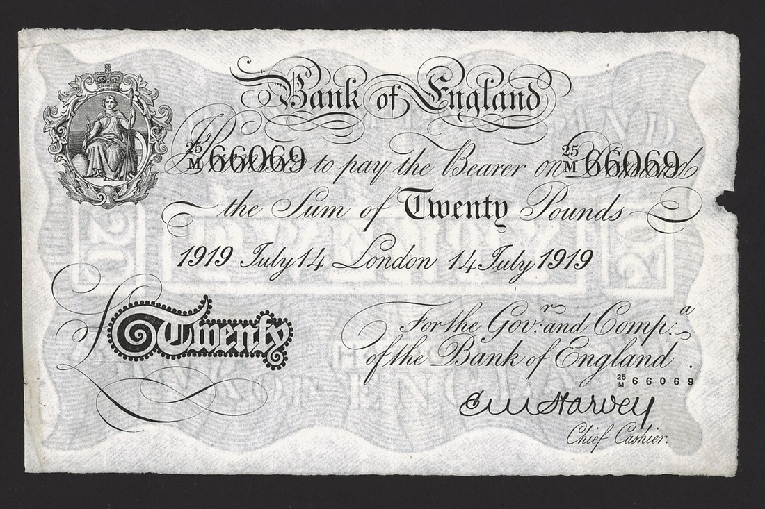 Bank of England, Ernest Musgrave Harvey, £20, London, 14 July 1919, serial number 25M 66069 (EPM B209c, Pick 314a), good very fine