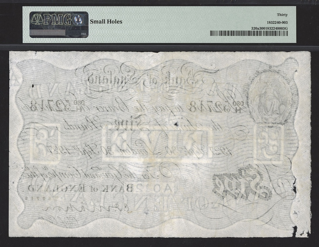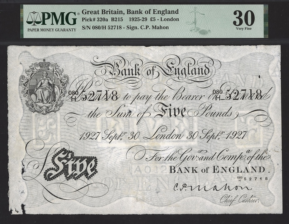 Bank of England. C.P. Mahon, £5, London, 30 September 1927, serial number 080/H 52718, (EPM B215, Pick 320a), in PMG holder, small holes, 30 Very Fine