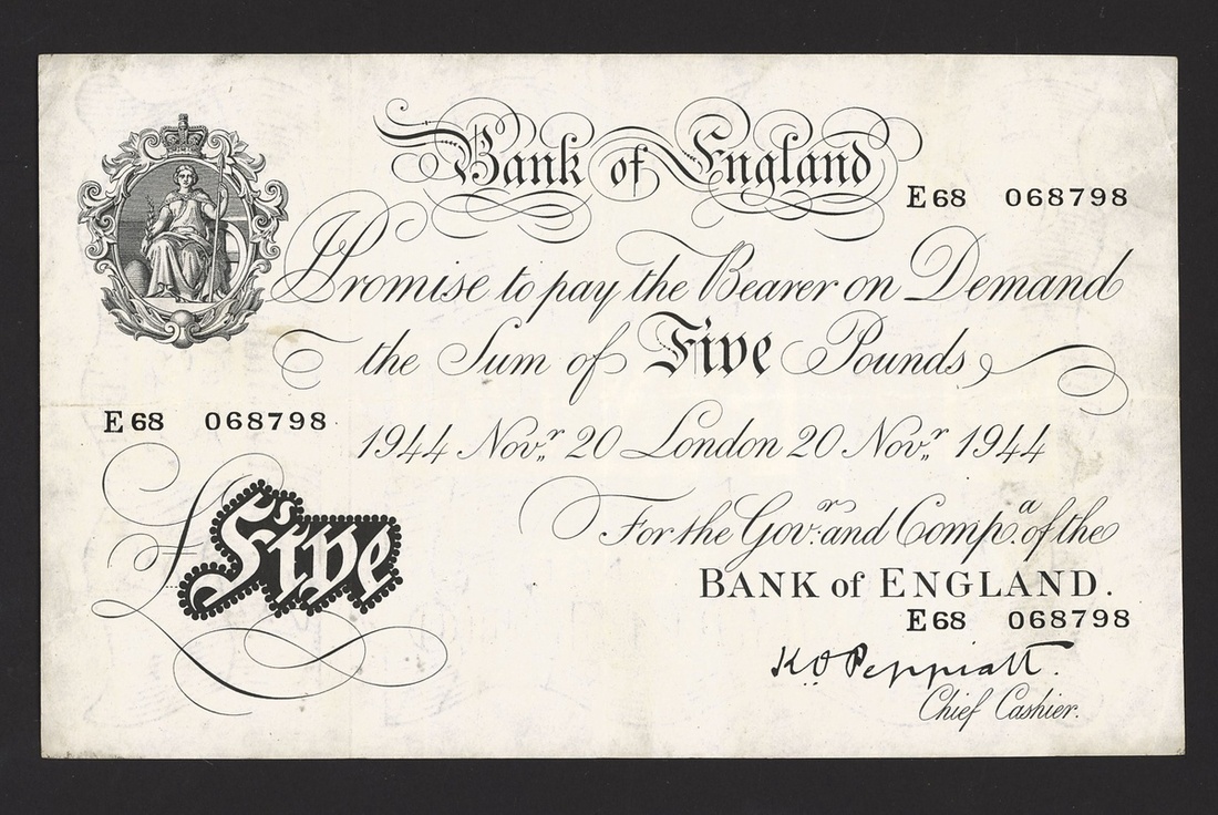 Bank of England, K.O. Peppiatt, £5, London, 'Thick Paper', 20 November 1944, serial number E68 068798, (EPM B255), an early run, stamps at reverse, very fine